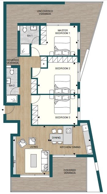 Comprising of five apartment blocks, the development offers a variety of two and three-bedroom apartments designed to suit diverse preferences and lifestyles. Each residence includes its dedicated parking space, ensuring both convenience and security, along with storage rooms for added practicality. The commitment to individual comfort and well-being extends beyond the private quarters into the shared spaces that foster a strong sense of community.