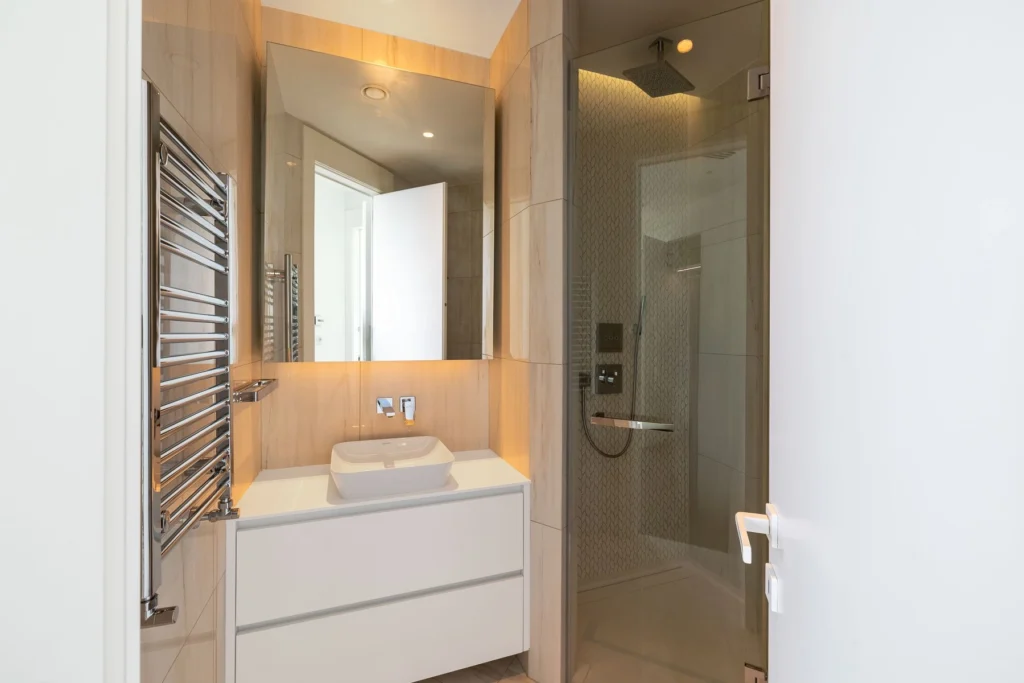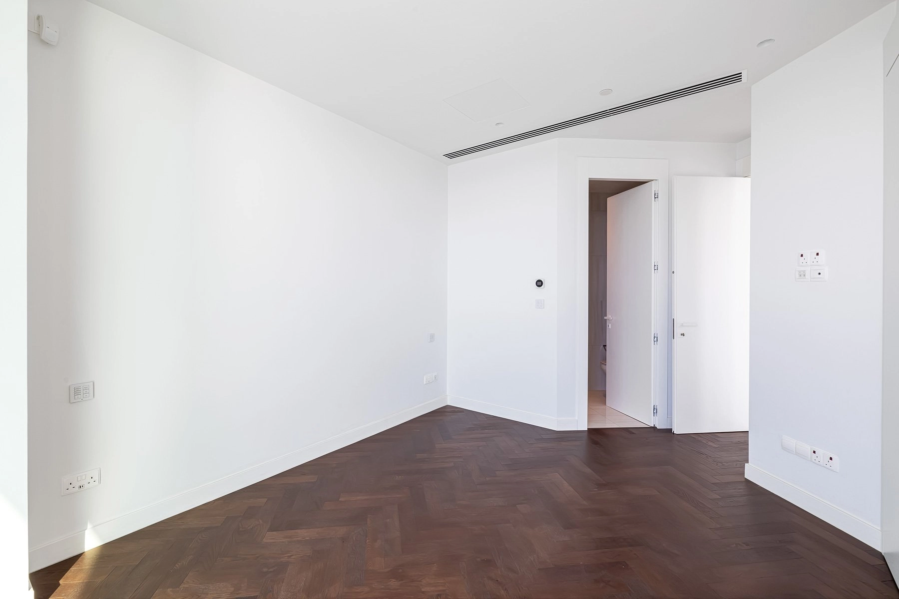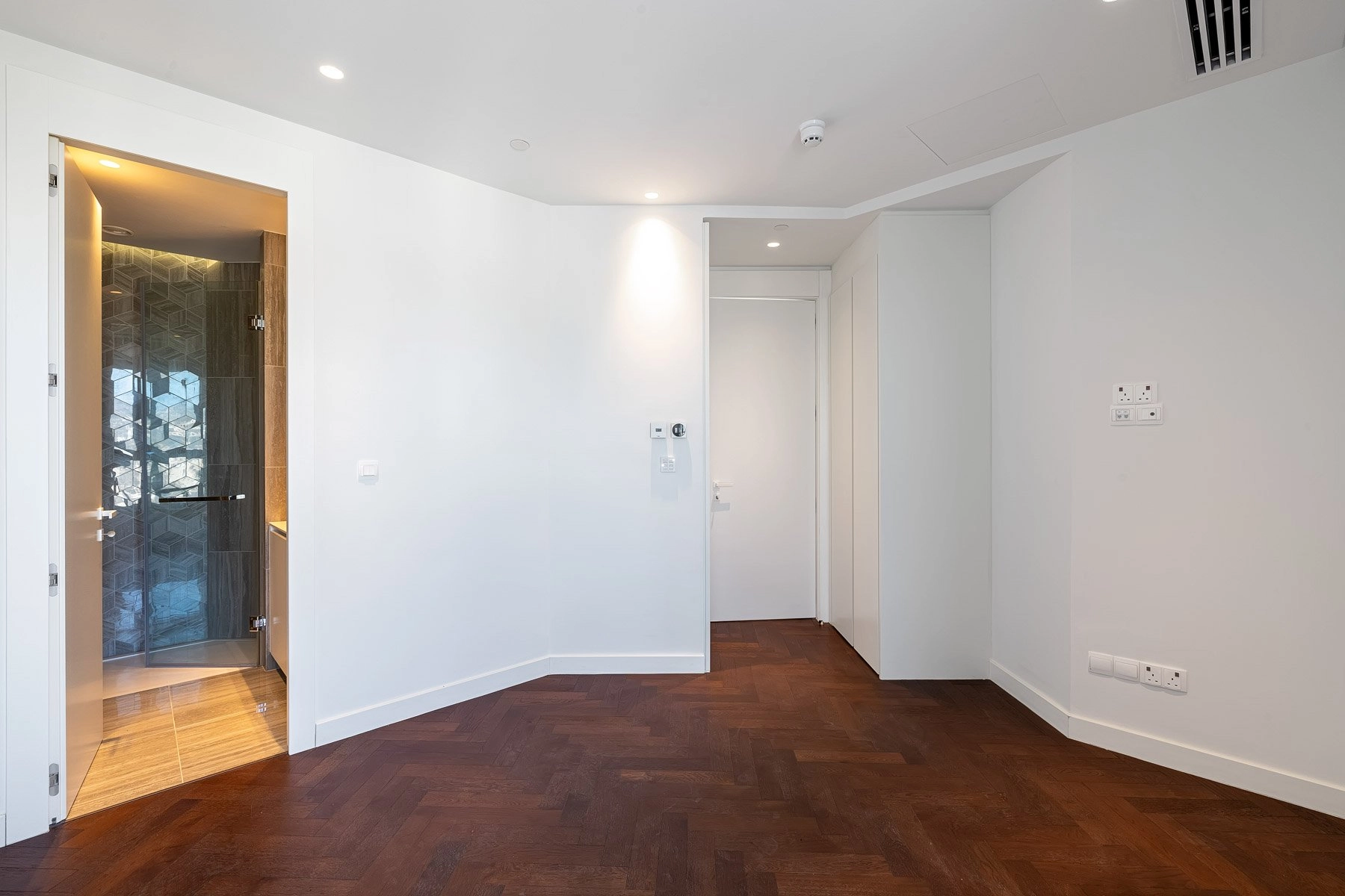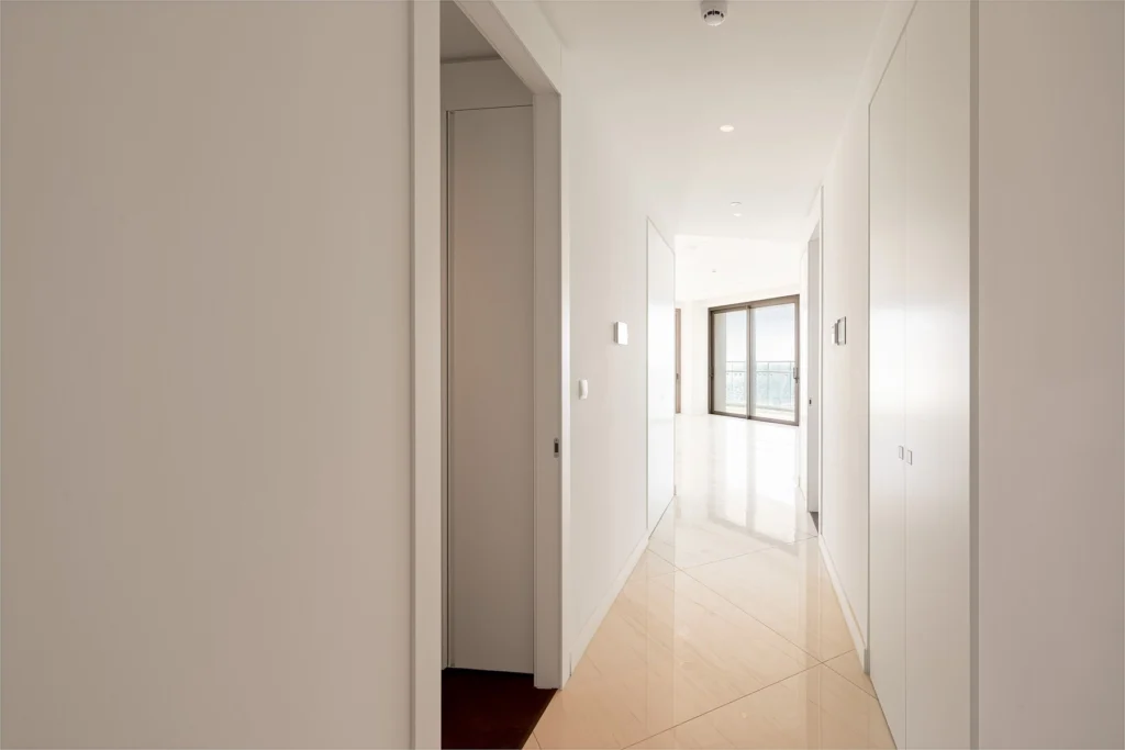 The open-plan layout creates an expansive living environment, where a pristine white living area enhances the sense of light and space. The kitchen stands in striking contrast, featuring deep-toned cabinetry and a stunning dark stone finish, blending functionality with refined aesthetics. The same rich hues extend into the kitchen’s surfaces, adding depth and a sense of understated luxury.