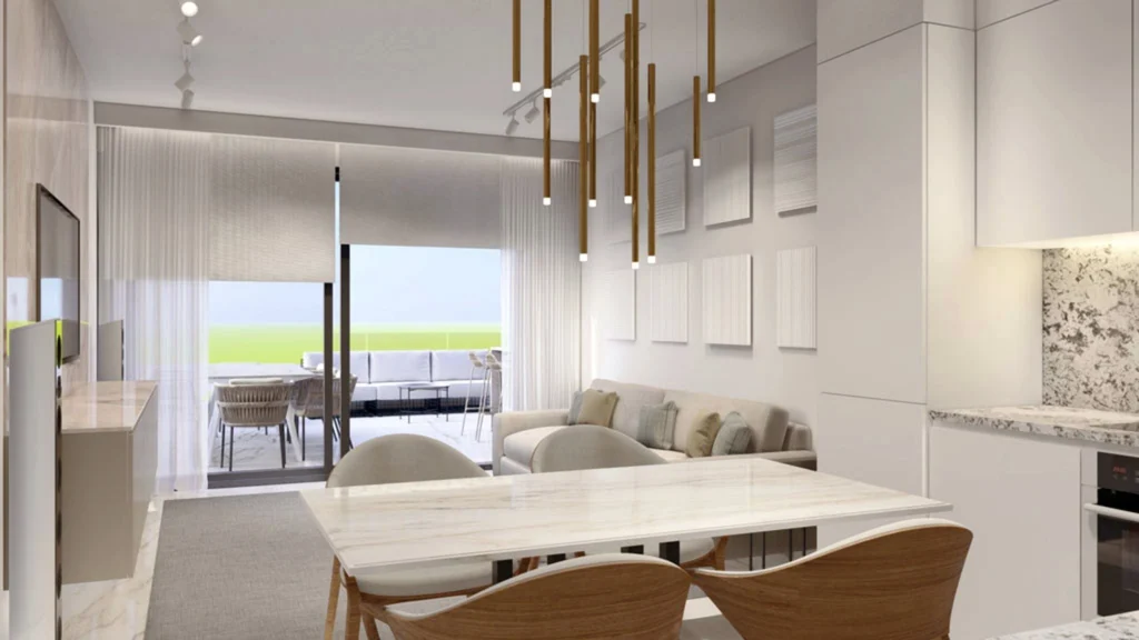 Each apartment is meticulously crafted, featuring spacious open-plan interiors and floor-to-ceiling windows that bathe the living spaces in natural light. Electric shutters in the bedrooms enhance comfort, while kitchens with granite countertops and sleek cabinetry embody modern elegance. Bathrooms are adorned with premium ceramic finishes, adding a touch of refinement. Penthouses offer underfloor heating, concealed air conditioning, and private rooftop terraces with jacuzzis and barbecue areas, creating the perfect space for relaxation and entertainment.