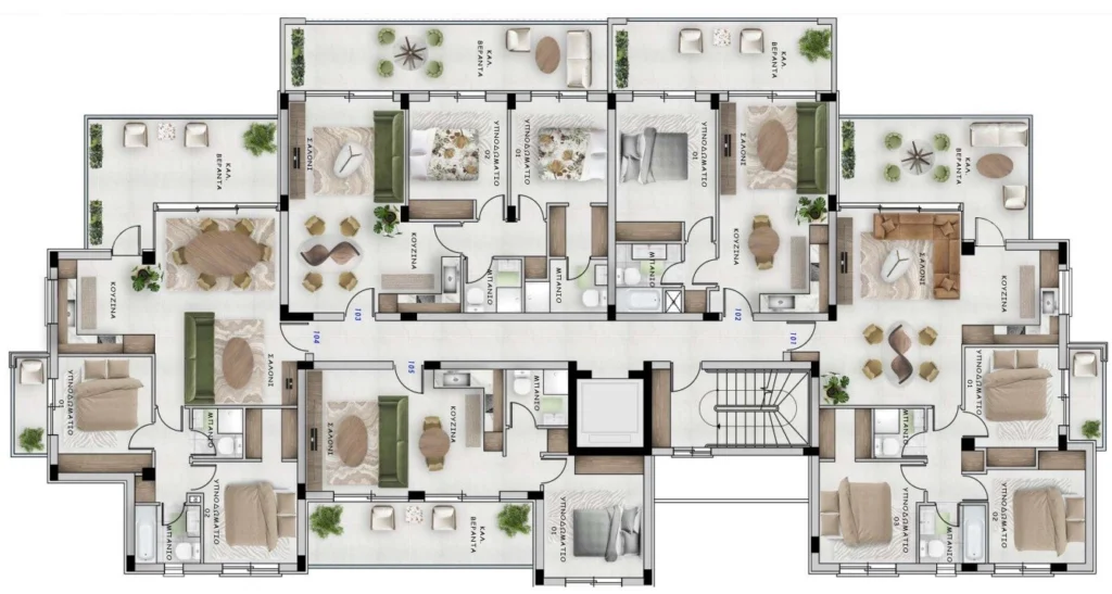 Each residence is thoughtfully designed, featuring high-quality finishes. Living areas are adorned with ceramic flooring, while bedrooms offer the warmth of laminate surfaces. Large double-glazed windows ensure superior thermal and sound insulation, and generous terraces extend the living space, creating a perfect outdoor retreat. Modern elevators provide easy access to all floors, while a solar water heating system enhances energy efficiency.