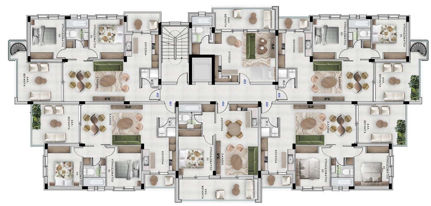 Each residence is thoughtfully designed, featuring high-quality finishes. Living areas are adorned with ceramic flooring, while bedrooms offer the warmth of laminate surfaces. Large double-glazed windows ensure superior thermal and sound insulation, and generous terraces extend the living space, creating a perfect outdoor retreat. Modern elevators provide easy access to all floors, while a solar water heating system enhances energy efficiency.