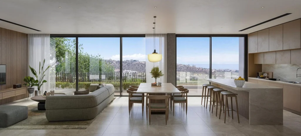 The development offers a refined selection of villas, spacious three-bedroom houses, and elegant apartments, each designed with light-filled spaces, functional layouts, high-quality finishes and sophisticated interiors. Floor-to-ceiling windows and generous terraces take full advantage of the panoramic views, while premium materials, energy-efficient solutions, and smart home systems ensure both comfort and sustainability.