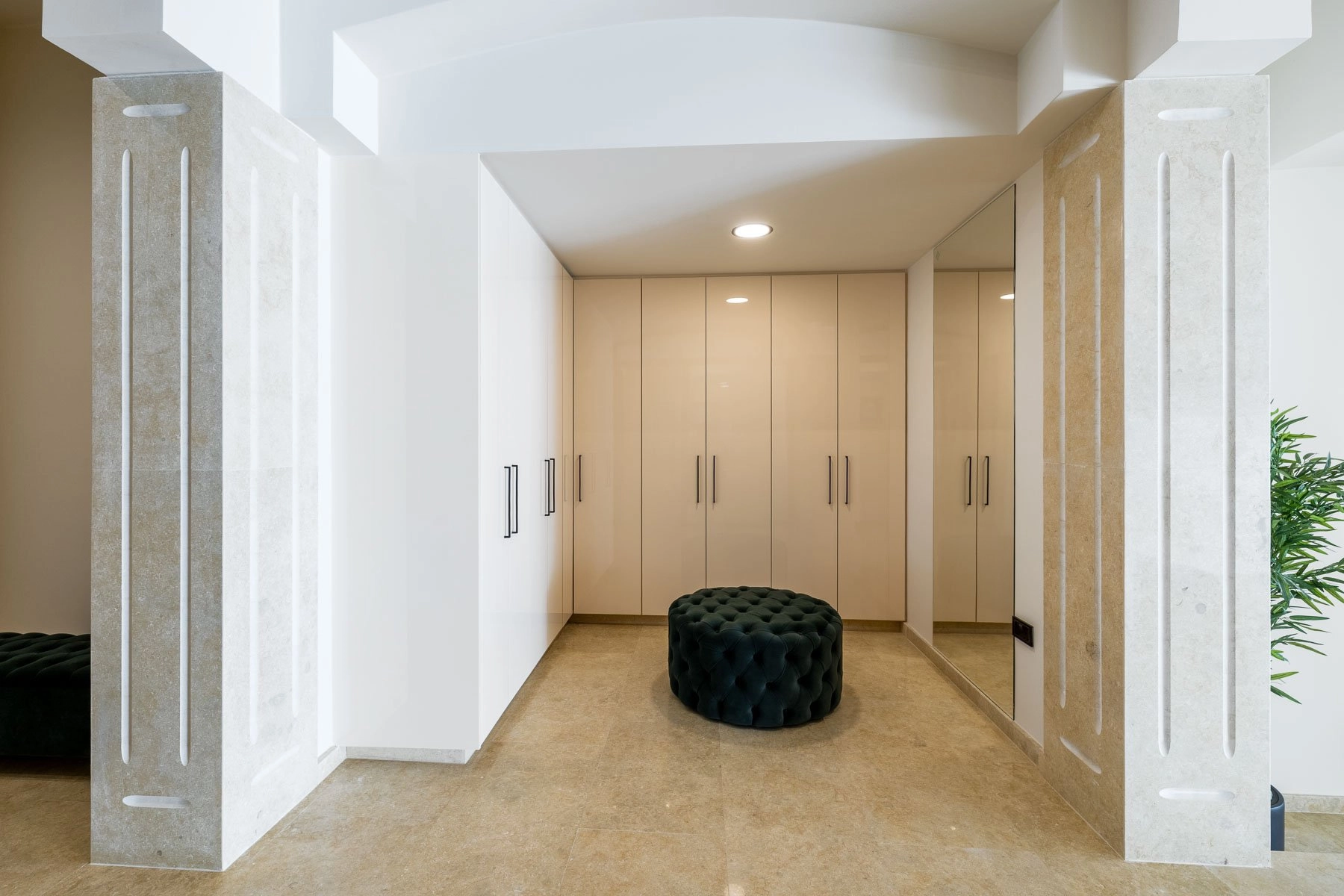 With breathtaking, unobstructed sea views, this meticulously designed villa ensures both comfort and style. The ground floor features a private cinema, a fully equipped gym, a technical room, a garage, and a modern kitchen. The first and second floors are smartly divided into two mirror-image zones, perfect for dual-family living, each offering a living room, kitchen, office, and three en-suite bedrooms.