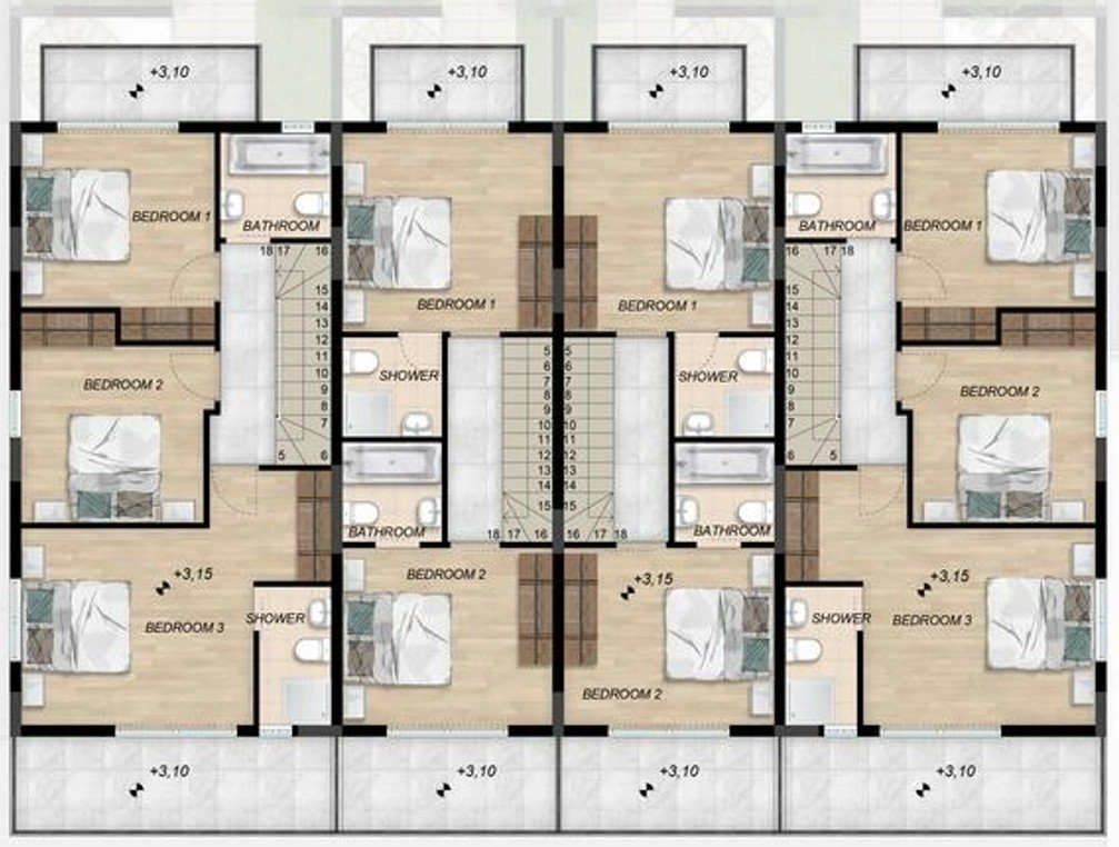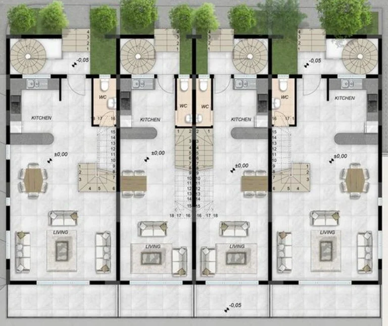 The residences span two thoughtfully arranged levels, featuring open-plan living spaces bathed in natural light, elegant finishes, and clean architectural lines. Modern kitchens flow into airy lounge areas that open onto private outdoor spaces—perfect for quiet mornings or relaxed evenings. Upstairs, the spacious bedrooms provide privacy and functionality, with large windows and carefully curated materials.