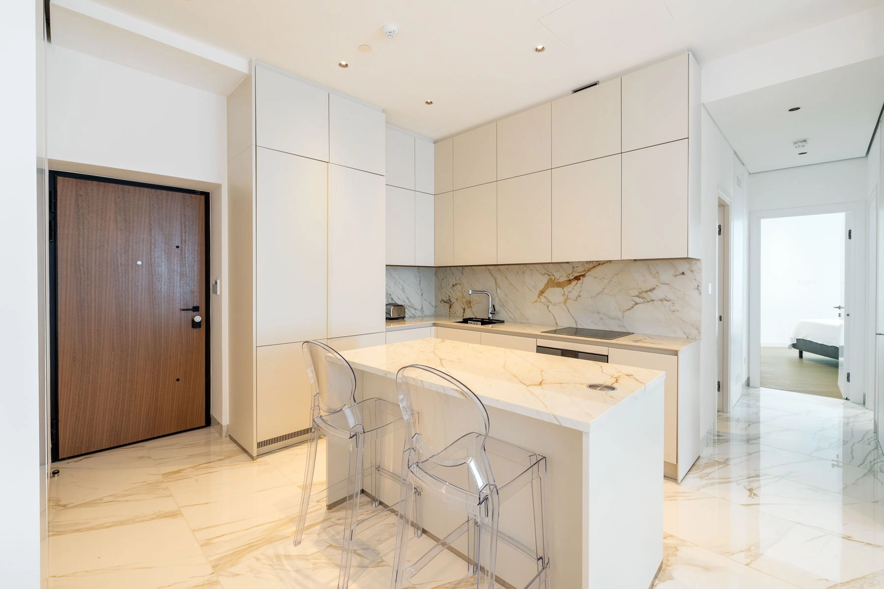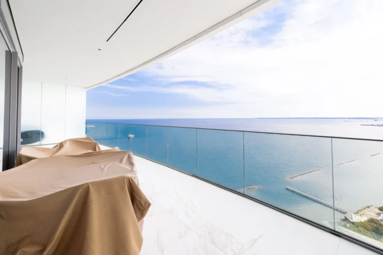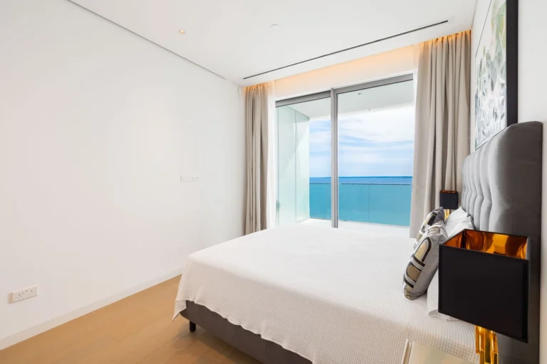 The open-plan living area welcomes you with breathtaking sea views framed by floor-to-ceiling windows, flooding the space with natural light. A sleek, fully equipped kitchen with top-tier appliances and custom cabinetry inspires culinary creativity, while the dining area creates a natural gathering point for family and friends. Two serene bedrooms offer restful privacy, and two elegant bathrooms complete the interior with style and practicality.