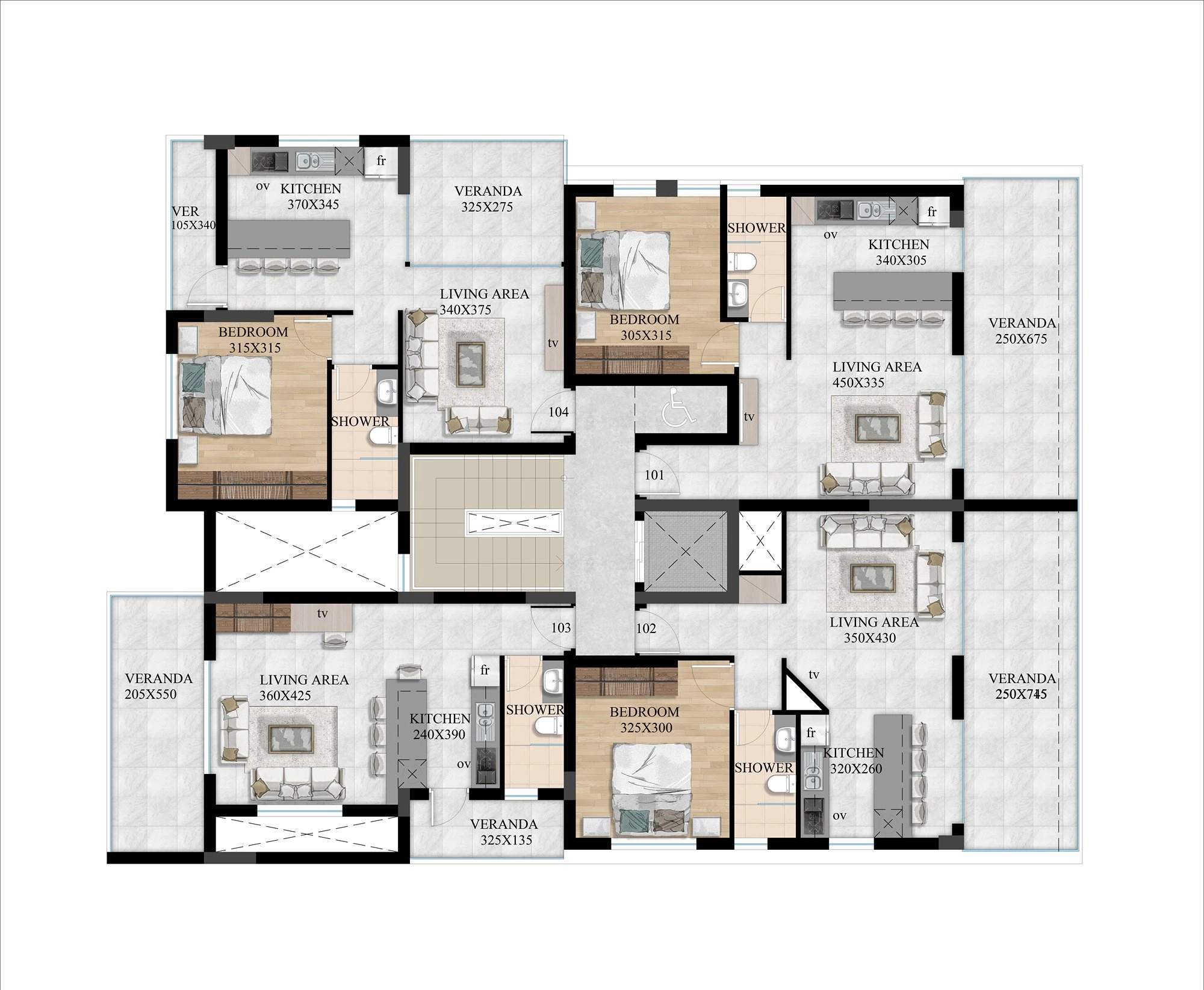 Each apartment is thoughtfully finished with high-quality ceramic tiles, engineered wood flooring, stylish bathrooms, and elegant kitchens. Energy-efficient glazing, security doors, and smart lighting systems add to the sense of comfort and security.