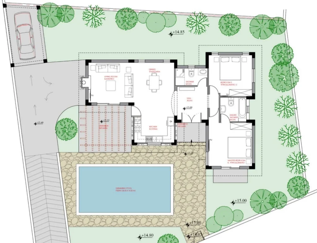 Each villa boasts a carefully planned layout, with bright, airy interiors enhanced by floor-to-ceiling windows that invite in natural light. Available in two- or three-bedroom configurations, the residences come equipped with air conditioning, solar panels, and a private swimming pool. Spacious verandas provide the perfect setting for outdoor relaxation, while landscaped gardens offer both beauty and privacy.