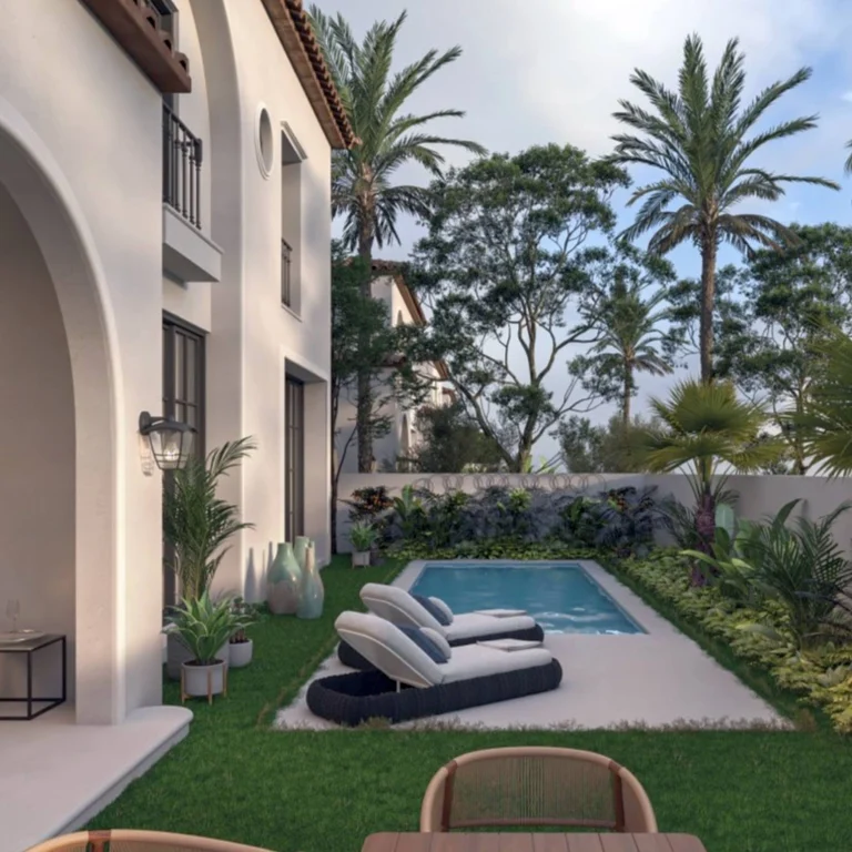 Each villa boasts a bright, open-plan layout with 3 spacious bedrooms, 3 bathrooms, a comfortable outdoor terrace, landscaped garden, and the option for a private pool. Floor-to-ceiling windows invite natural light into the interiors, while high ceilings, premium materials, and sophisticated finishes add a sense of timeless comfort. Two private parking spaces are included for added convenience.