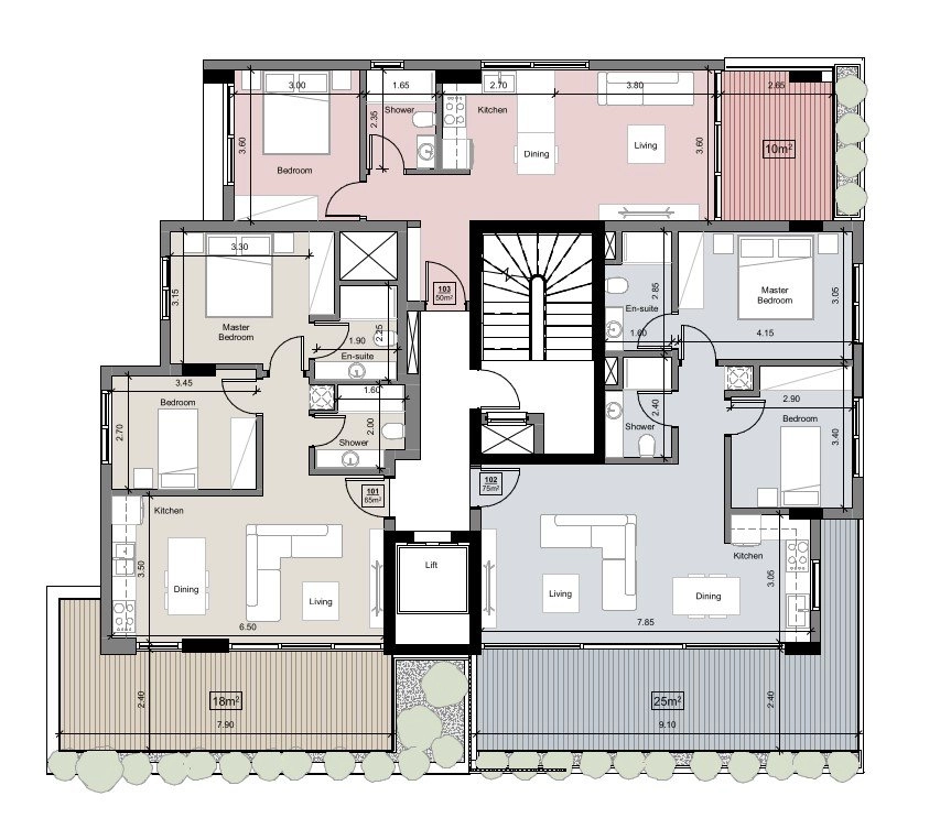 With only ten meticulously crafted apartments, the building ensures exclusivity and privacy. Each one- and two-bedroom residence is thoughtfully designed with open-plan layouts, oversized terraces, and high ceilings over 3 meters, enhancing the feeling of space and light. Floor-to-ceiling thermal aluminum windows and VRV climate systems provide year-round comfort, while photovoltaic panels, EV charging provisions, and net metering promote sustainability.