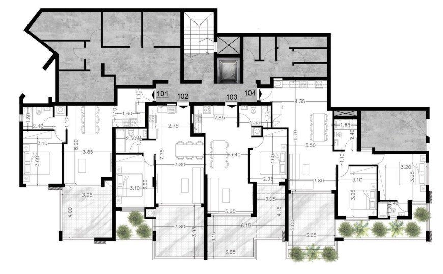 Each residence is thoughtfully designed with open-plan architecture, high ceilings, and a seamless connection to spacious private verandas. Premium finishes define every detail—from large-format ceramic tiles and synthetic granite countertops to glass railings, sound-insulating double glazing, and thermally insulated exterior walls. A private storage room, allocated parking space, and gated access further enhance convenience and security.