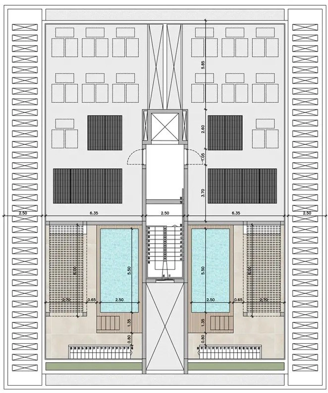 Comprising only fourteen apartments across four levels, the project offers a thoughtful mix of one-, two-, and three-bedroom homes. The upper floor is reserved for two signature penthouses, each with its own private rooftop garden and swimming pool—a rare privilege in this central location. Open-plan interiors are framed by deep verandas, extending the living space and inviting the outdoors in.