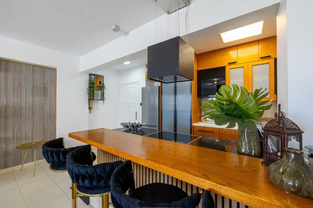 The apartment features a sleek modern design with warm, inviting tones and is completely move-in ready. It is fully furnished and equipped with all essential electrical appliances for immediate comfort.