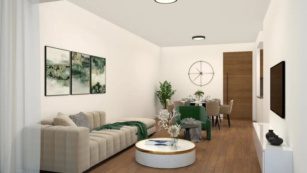 The apartment’s interior is thoughtfully crafted to combine functionality and style. The open-plan living space is filled with natural light and flows seamlessly onto a spacious covered veranda, perfect for quiet mornings or warm evenings outdoors. A modern kitchen blends aesthetics with practicality, while the comfortable bedroom and sleek bathroom add to the sense of refined ease.