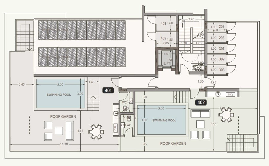 Clean architectural lines, natural materials, and expansive glass facades create a harmonious interplay between form and function. Every residence features soaring three-meter ceilings, water-based underfloor heating, and concealed ducted air conditioning. Spacious private balconies and terraces extend the living areas outdoors, while penthouses boast rooftop gardens with private pools and panoramic city views.
