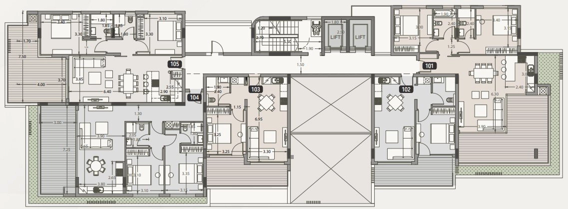 Spacious one- to three-bedroom apartments feature 3-meter ceilings, underfloor water heating, and energy-efficient VRV climate systems for year-round comfort. Each residence opens onto a large private terrace with full-height windows, allowing natural light and garden views to flow in while maintaining a sense of privacy and calm.
