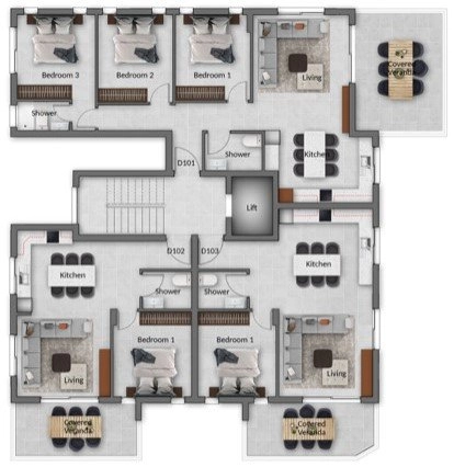 The building features just seven elegant residences: four stylish apartments with one bedroom, two spacious three-bedroom apartments, and one two-bedroom residence. Each unit has been designed with comfort in mind, offering bright interiors, smart layouts, and covered verandas that invite residents to enjoy outdoor living and the gentle coastal breeze.