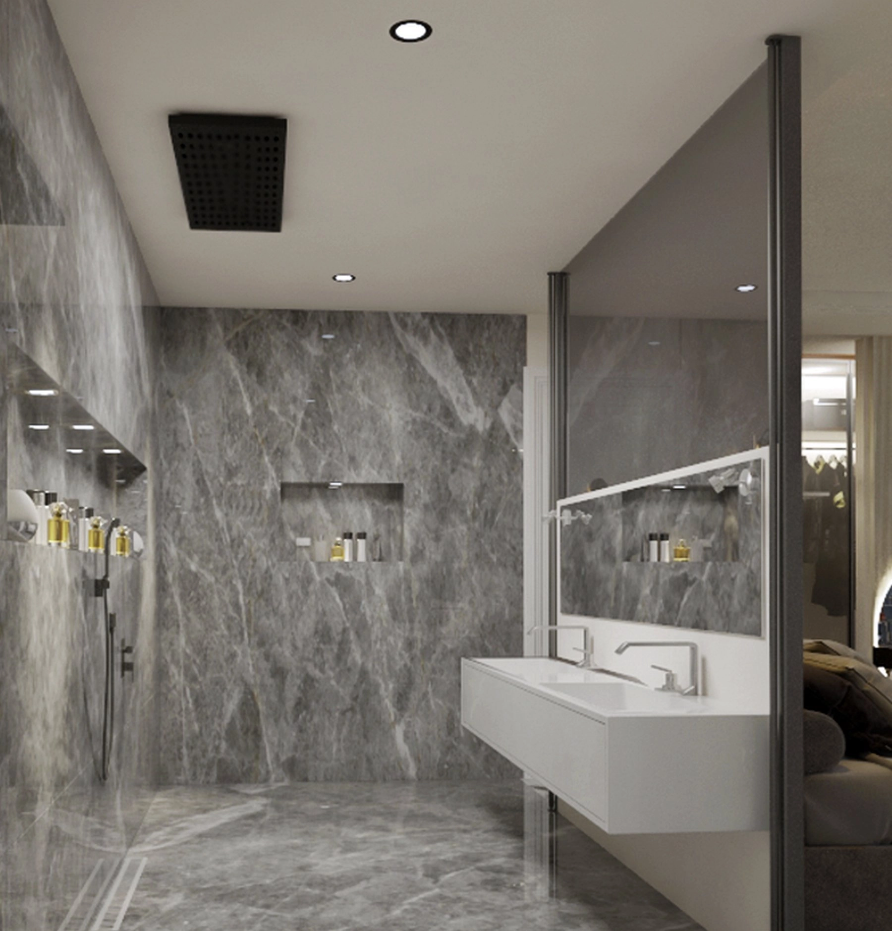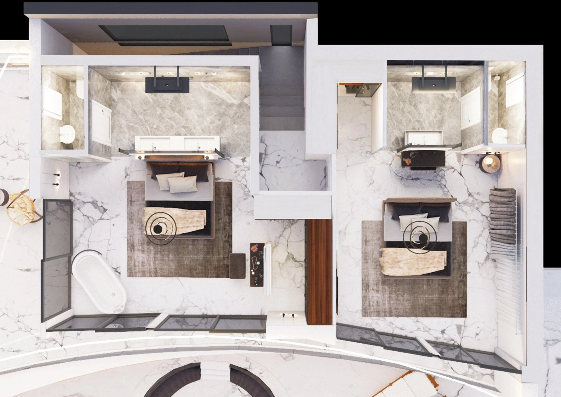 The villas offer generously sized bedrooms, each with private designer bathrooms and walk-in wardrobes, opening to terraces that capture inspiring panoramas of the mountains and the sea. A private rooftop further extends the living experience, ideal for quiet moments or gathering with friends.