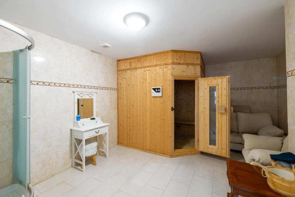 The villa features five bedrooms, four of which are en-suite, as well as multiple living and dining zones. A separate kitchen is complemented by a guest kitchen on the lower level. The basement floor is a destination in itself—complete with a lounge and bar, home cinema, billiard area, sauna with shower, guest suite, and independent access for use as a private residence.