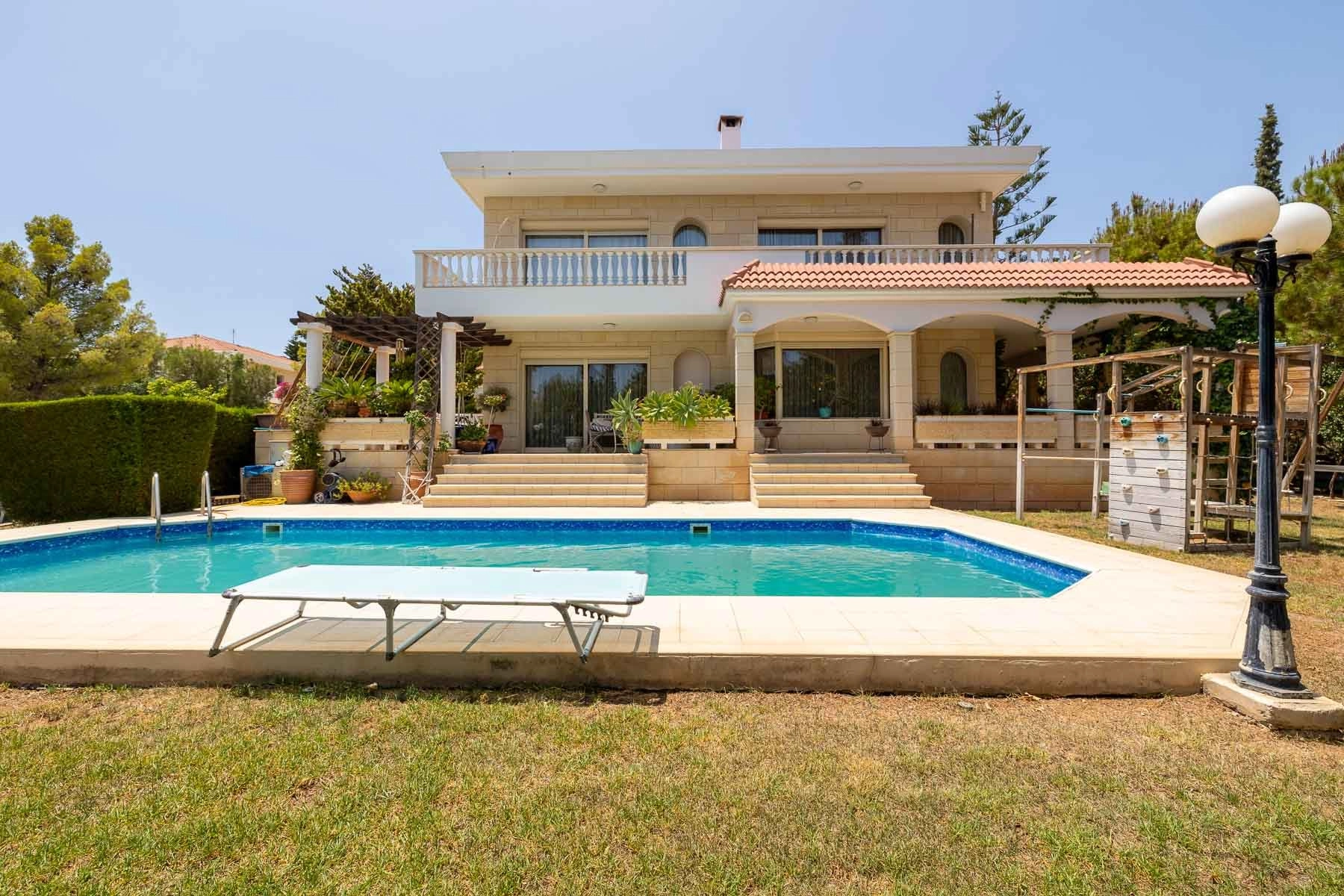 Refined finishes include Italian natural wood cabinetry, Miele appliances, beige marble floors, and solid parquet in the bedrooms. A charming attic space currently serves as an office, but can easily be converted into a sixth bedroom. Outside, manicured gardens with a children’s play area surround a private pool, sunlit terraces, and multiple parking bays.