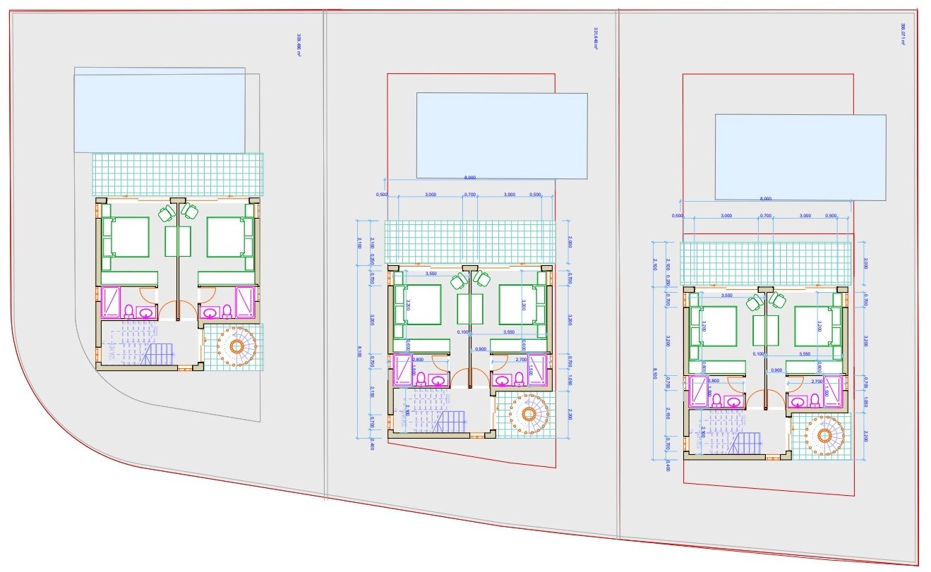 Each residence boasts a private 8×4m swimming pool, landscaped garden, outdoor shower, large veranda, and optional roof garden. High-spec finishes include marble staircases, granite countertops, fitted wardrobes, and provisions for air conditioning, central heating, and photovoltaic systems. Covered parking is also included.