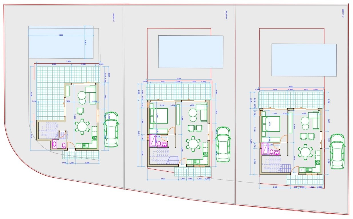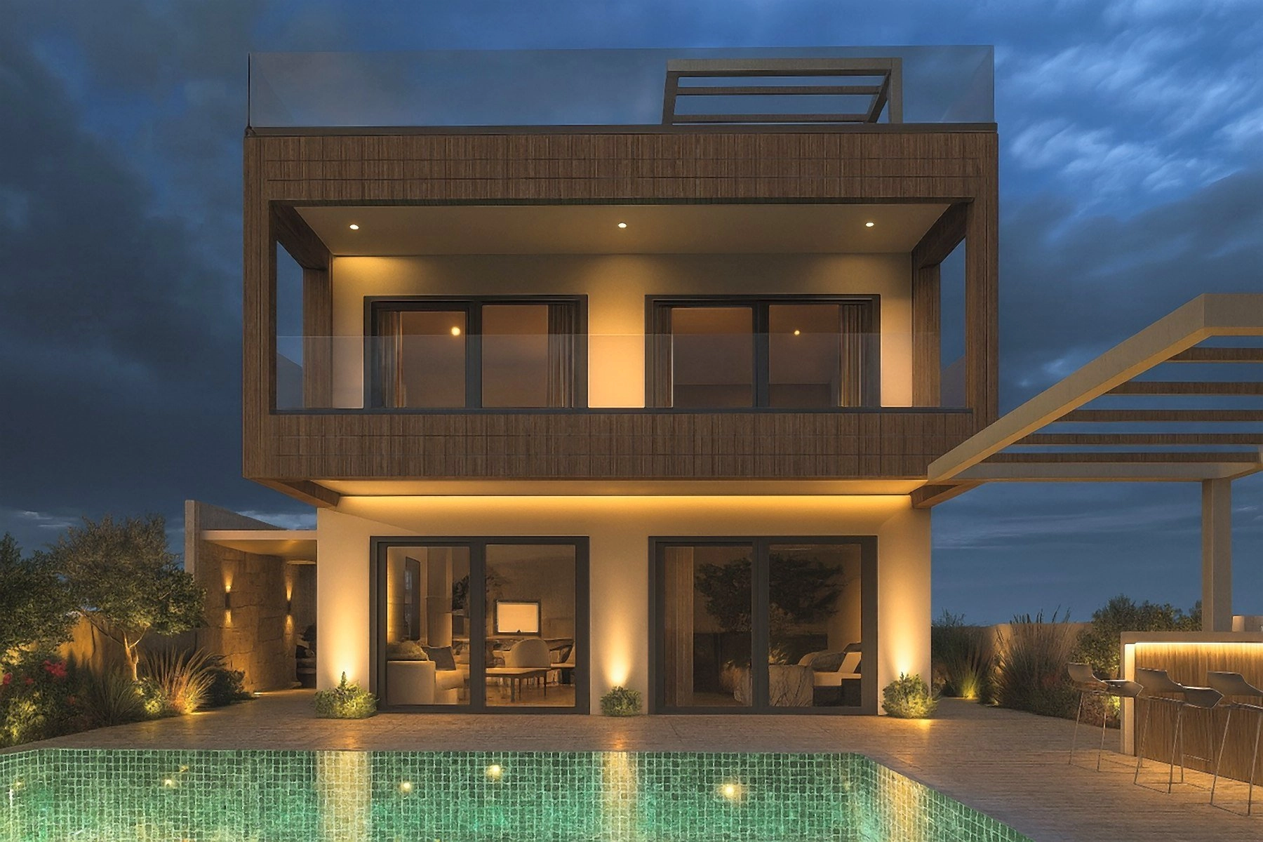 Each residence boasts a private 8×4m swimming pool, landscaped garden, outdoor shower, large veranda, and optional roof garden. High-spec finishes include marble staircases, granite countertops, fitted wardrobes, and provisions for air conditioning, central heating, and photovoltaic systems. Covered parking is also included.