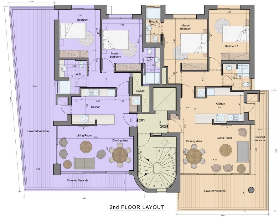 The upper floors feature six stylish two-bedroom apartments, including one with a private rooftop garden. Each apartment includes an en-suite bathroom in the main bedroom and a second bathroom for guests or family use, while contemporary finishes and quality materials reflect the project’s refined aesthetic.
