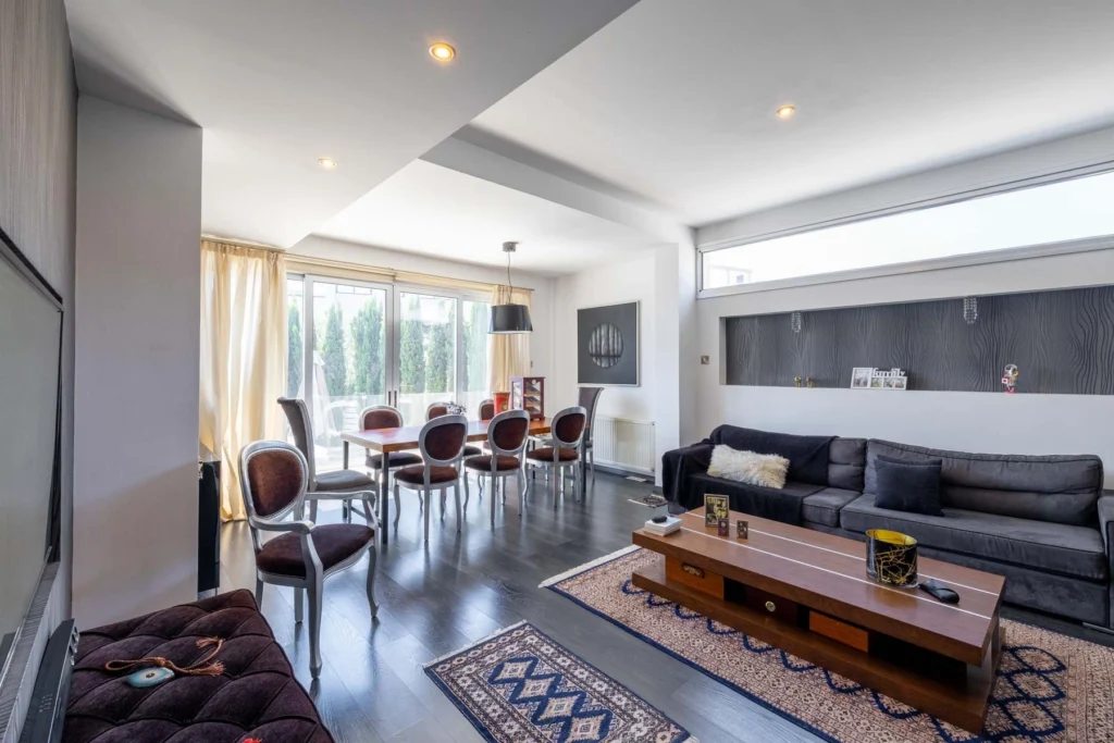 Outdoors, the property offers a stylish setting with landscaped areas designed for both relaxation and entertaining. A private garage with space for two cars, an additional storage room, and an outdoor shower add to the practicality. Combining a prime location, elegant design, and modern comforts, this villa is an ideal home for families seeking quality living in Limassol’s most desirable district.