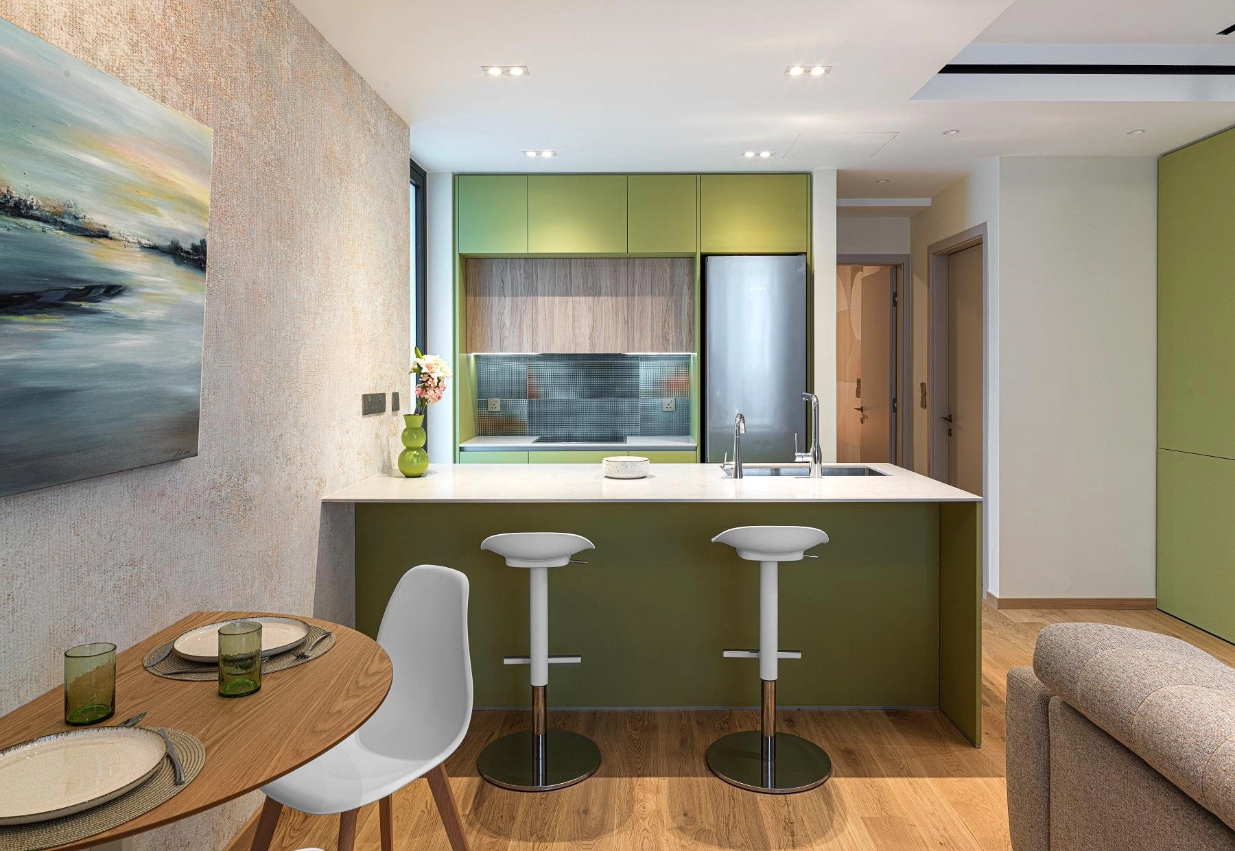 The attention to detail extends to the whole concept of the complex, ensuring a perfect balance between indoor and outdoor living. Privately-accessed leafy green gardens, a sparkling pool, a kids playground, a fitness area, and social spaces create opportunities for interaction and foster a sense of community among residents.