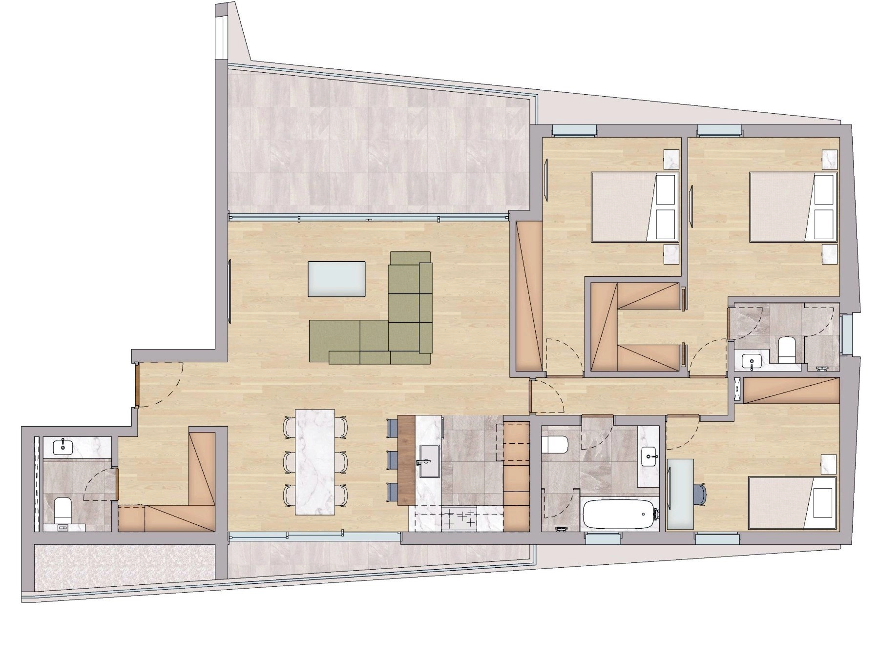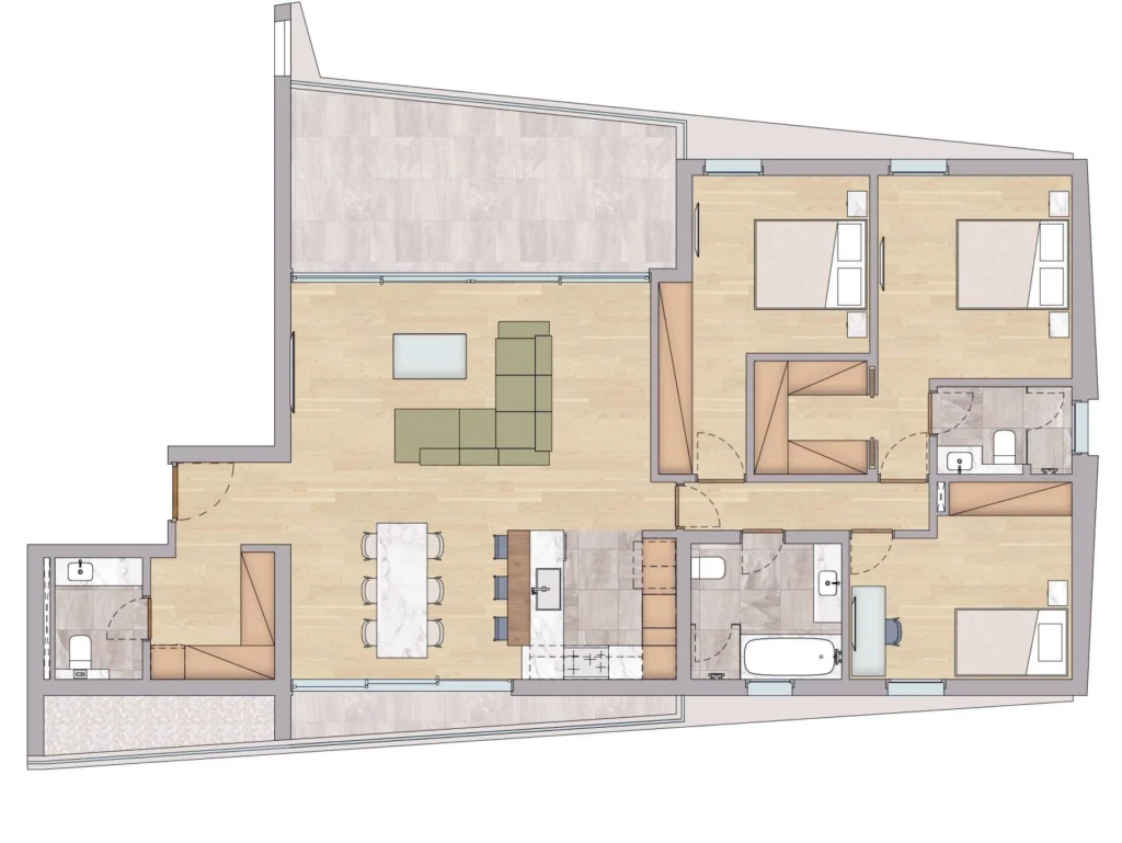 Comprising four buildings surrounding a beautifully landscaped courtyard, this project is a true masterpiece. The bold and expressive wall art reflects the spirit of community that thrives within the complex. Step inside and discover a world of thoughtfully designed apartments that redefine modern living.