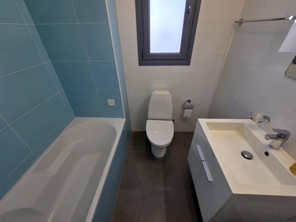 The apartment features a bright and spacious living room with an open-plan kitchen, fully fitted with modern electrical appliances, including a washing machine. There are three well-proportioned bedrooms, one of which is the master with its own en-suite shower. A family bathroom and an additional guest WC complete the layout. A large covered veranda extends the living space outdoors, offering an ideal spot for relaxation.