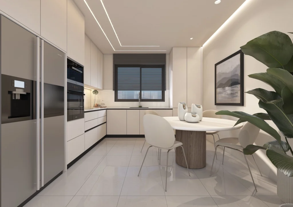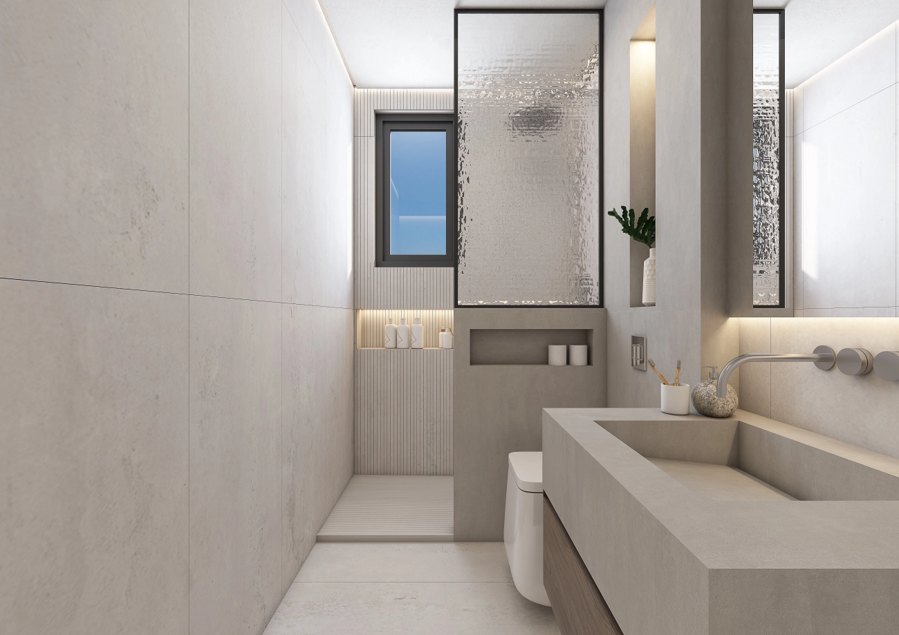 The bedrooms are designed with comfort and practicality in mind, featuring built-in wardrobes and direct access to stylish bathrooms. Bathrooms are finished with European ceramic tiles in marble effect and fitted with premium sanitary ware, reflecting timeless elegance.