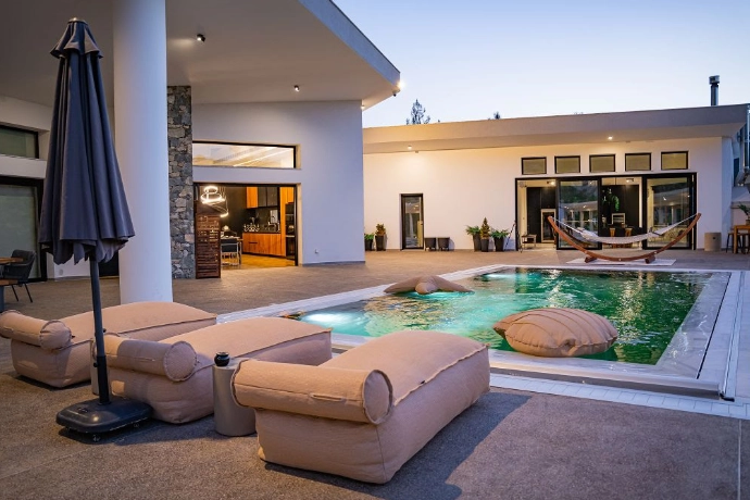 -Blending modern architecture with natural materials – stone, wood, and glass – the villa harmonizes beautifully with its surroundings.