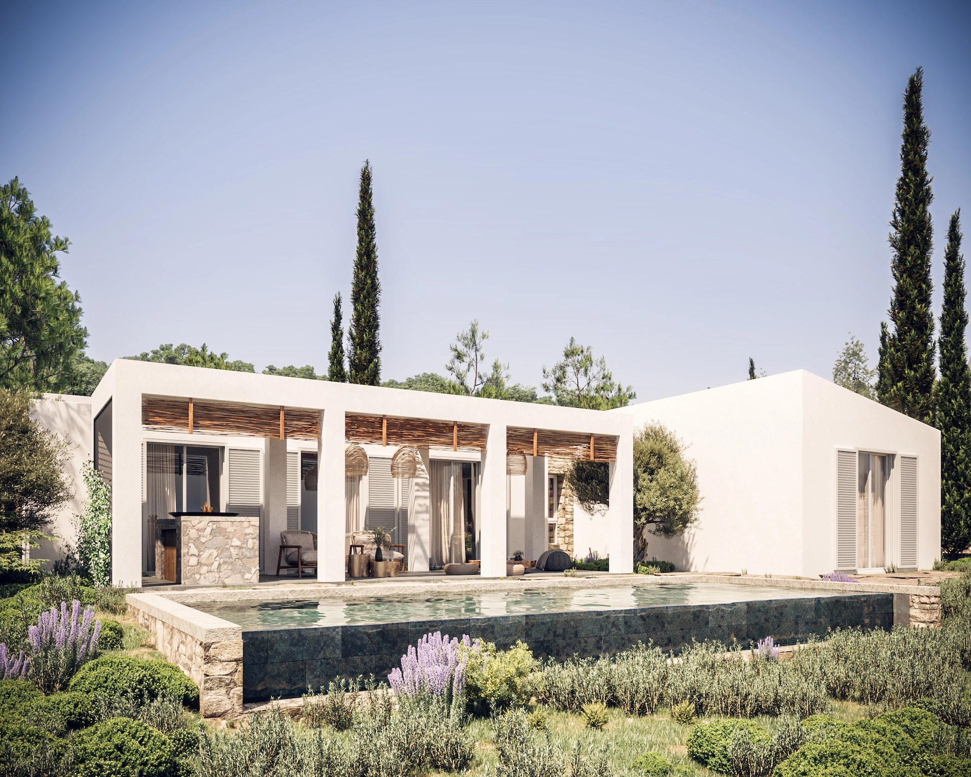 Each villa, thoughtfully crafted between 130–187 sqm, features 2 or 3 spacious bedrooms in both single-story and two-level layouts. Every home blends natural materials with bespoke finishes, creating a sense of effortless sophistication. Open-plan interiors flow seamlessly into expansive outdoor spaces with private swimming pools, jacuzzis, and landscaped gardens, embodying the essence of Mediterranean living.