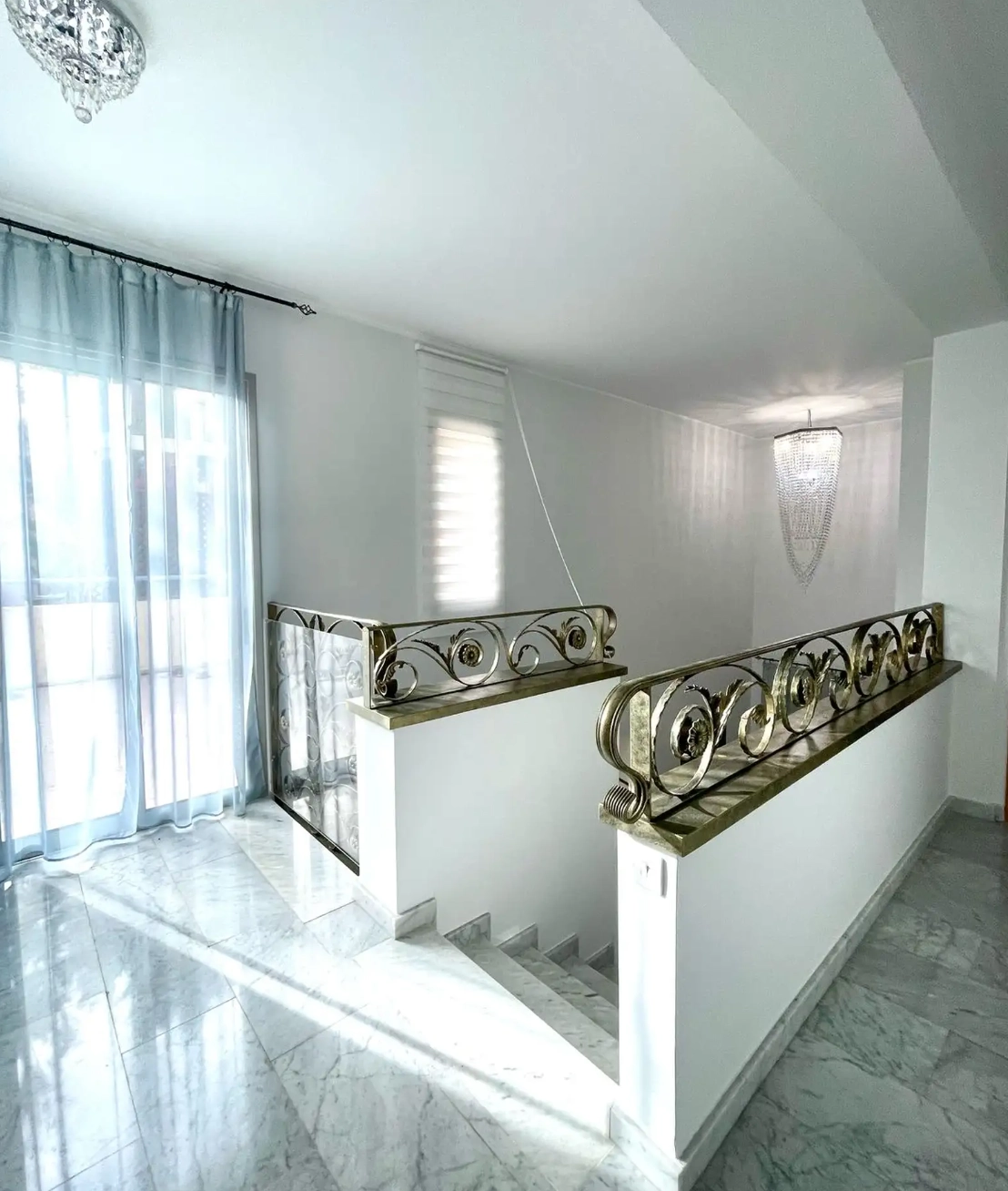 The property features an open and comfortable layout including a living room with fireplace, a semi-fitted kitchen and three bedrooms served by three bathrooms. The first-floor bedrooms include balconies that capture sea and mountain views, and the interior finishes reflect a contemporary aesthetic.