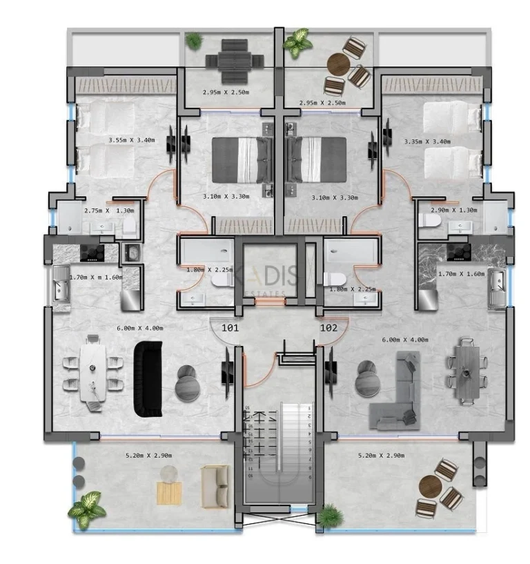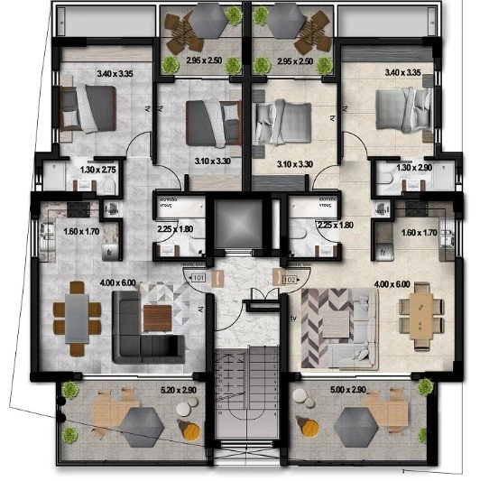 The four-storey building features eight thoughtfully planned apartments, ensuring both privacy and a sense of community. The first three levels each include two spacious 2-bedroom units, while the top floor is home to two impressive penthouses. Each penthouse is equipped with a 3.5 kW photovoltaic system and boasts its own private roof garden with stunning views of the Salt Lake — an ideal spot to unwind or host guests. The roof areas also provide a separate room with provisions for a bathroom, accessed by private outdoor stairs.
