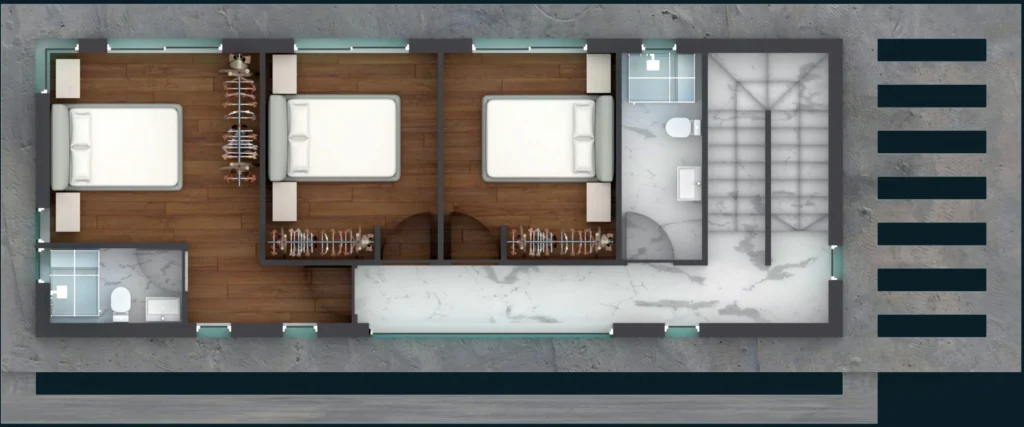 Designed in a sleek contemporary style, the villas feature clean geometric lines, panoramic windows, and refined finishes. These spacious two-story residences, available in 3- and 4-bedroom configurations, have been meticulously planned to provide an unparalleled sense of comfort and elegance. A standout feature is the private rooftop terrace, offering breathtaking sea views—an idyllic setting for relaxation and enjoying the gentle Mediterranean breeze.
