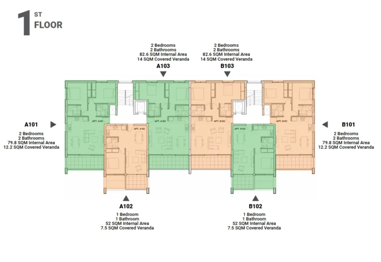 The project comprised of two blocks, with 12 in total. Each block has two floors and there are 3 apartments per story. All units have allocated covered parking on the ground level. Four apartments have access to a storage room while the rest have option for it.
