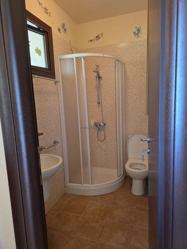 Apartment for Sale in Pyla area. The property consists of an open plan kitchen with living room and dining area as an open space, two bedrooms, one main bathroom with WC, and one shower en suite with WC and a covered veranda. The apartment has internal area of 75 sqm, the covered veranda is 9 sqm and the uncovered veranda another 9 sqm.