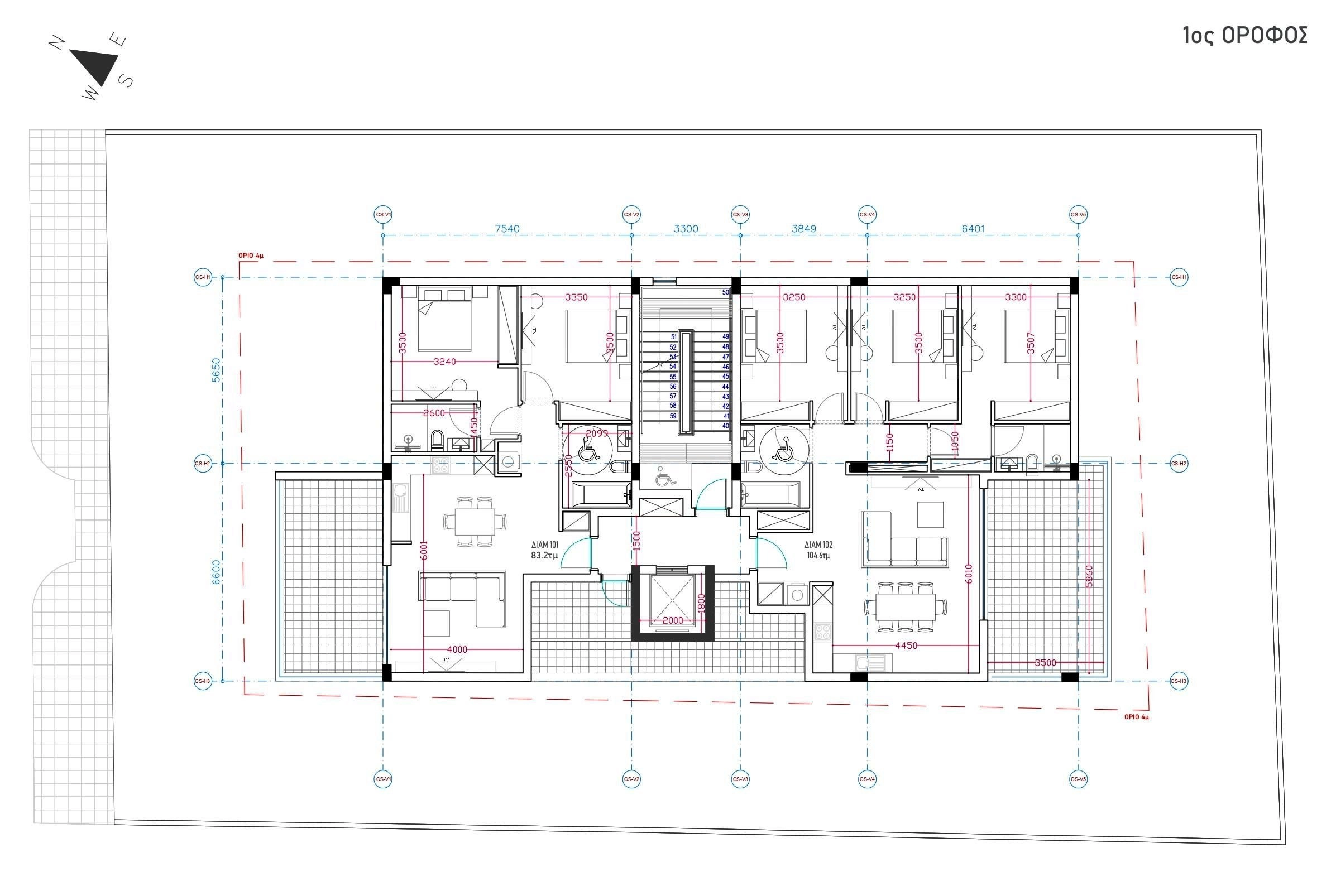 The three-bedroom apartment 102 with an internal area of 106 m² is located on the first floor of a four-storey building.