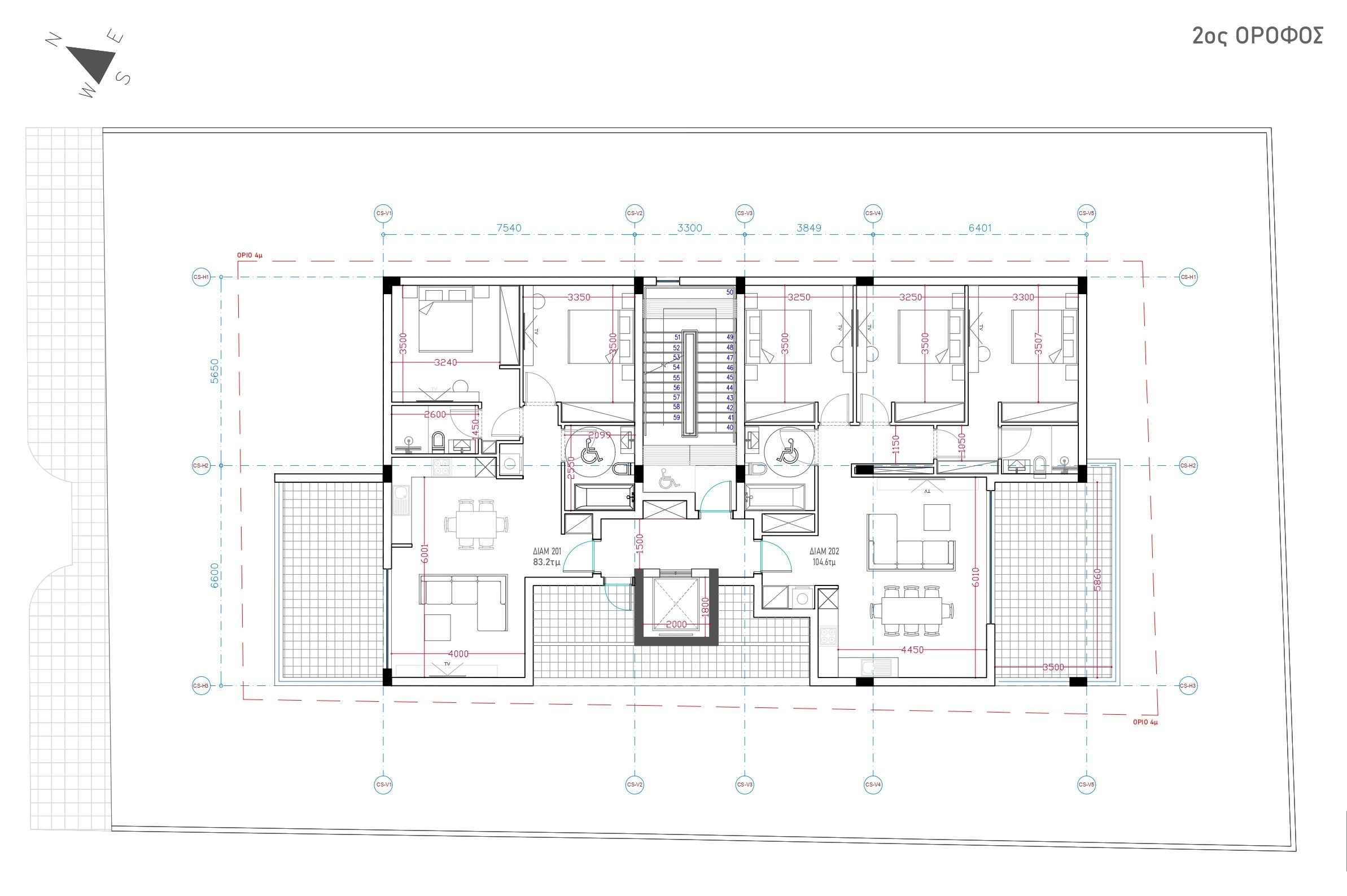 The three-bedroom apartment 202 with an internal area of 106 m² is located on the second floor of a four-storey building.