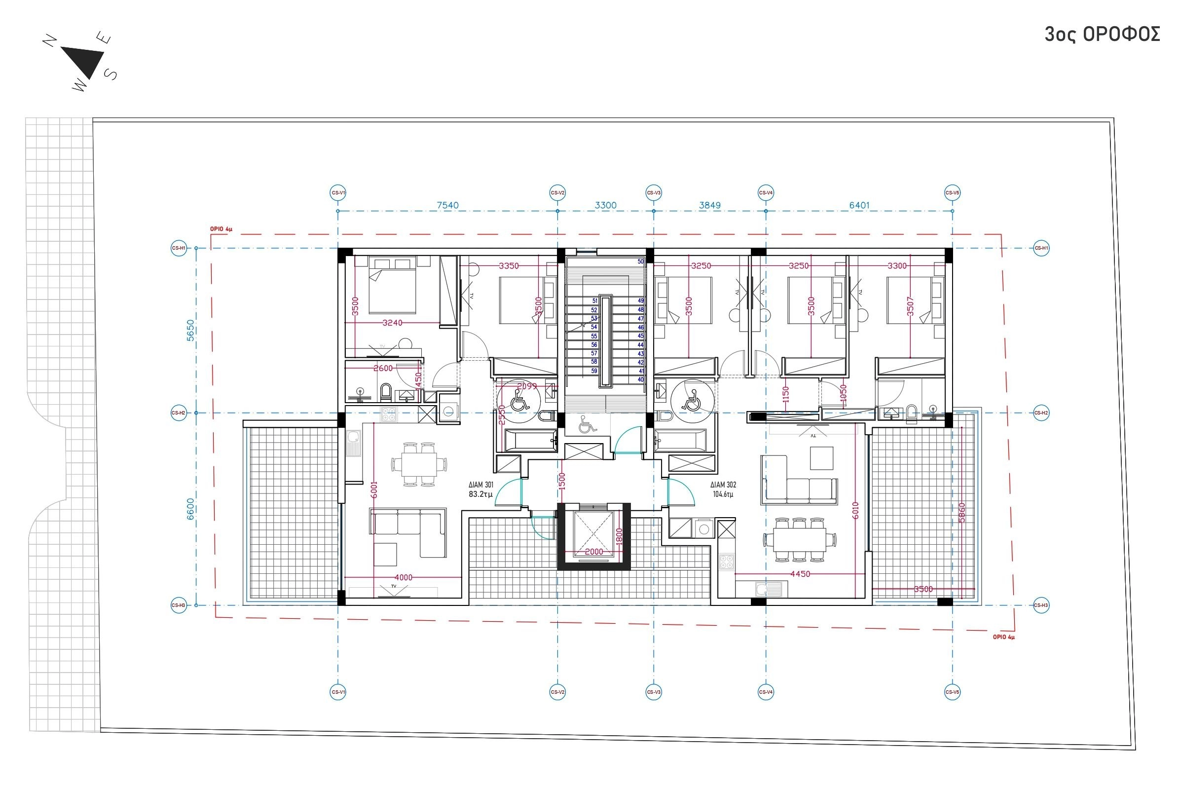 The three-bedroom apartment 302 with an internal area of 106 m² is located on the third floor of a four-storey building.