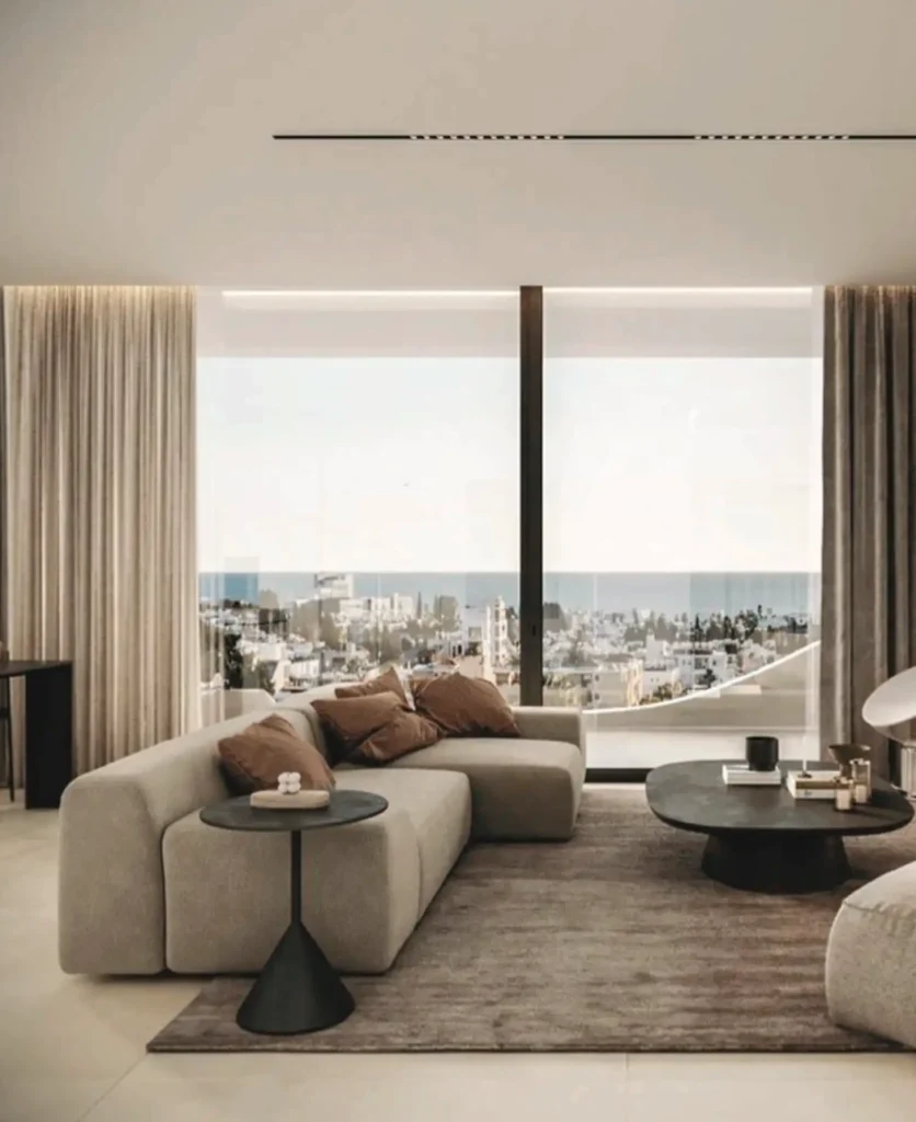 The penthouse features an elegant open-plan living area, three en-suite bedrooms, and a modern kitchen designed with high-end finishes. Expansive terraces provide panoramic views of the Mediterranean Sea and surrounding mountains. Large windows fill the space with natural light, creating a bright and airy ambiance.