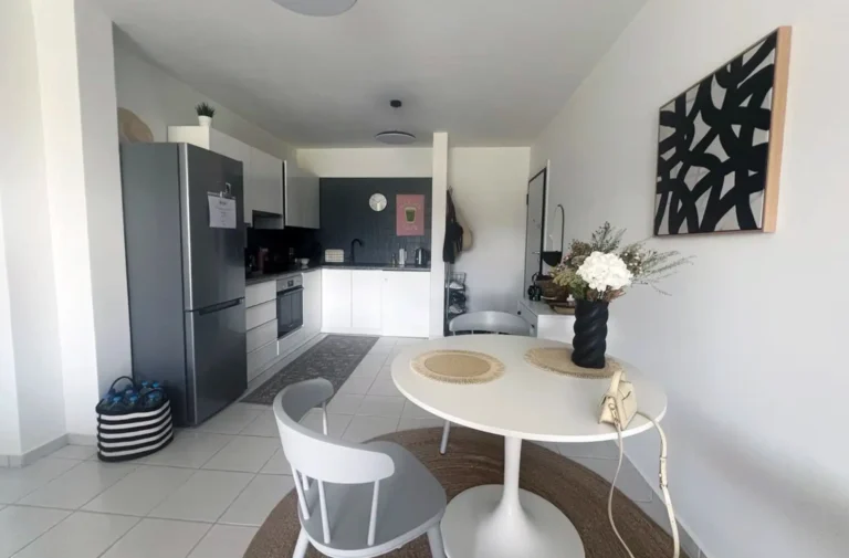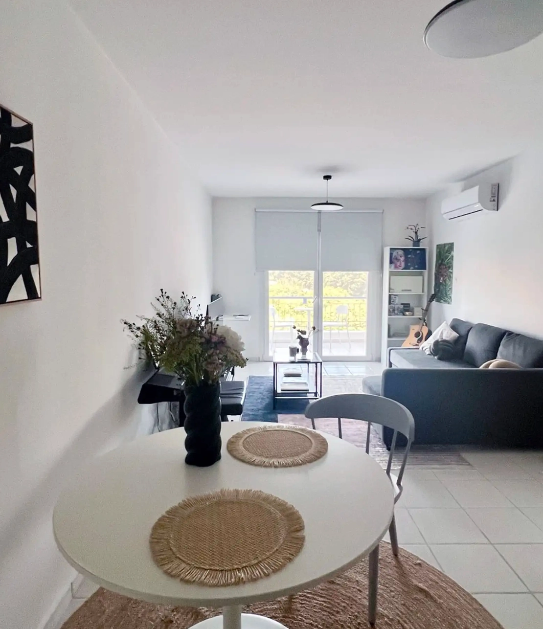 The apartment features a bright open-plan living area, a fully equipped kitchen, and two spacious bedrooms sharing a modern bathroom. Recently renovated, it includes premium German double-glazed windows, insect screens, and a reinforced front door.
