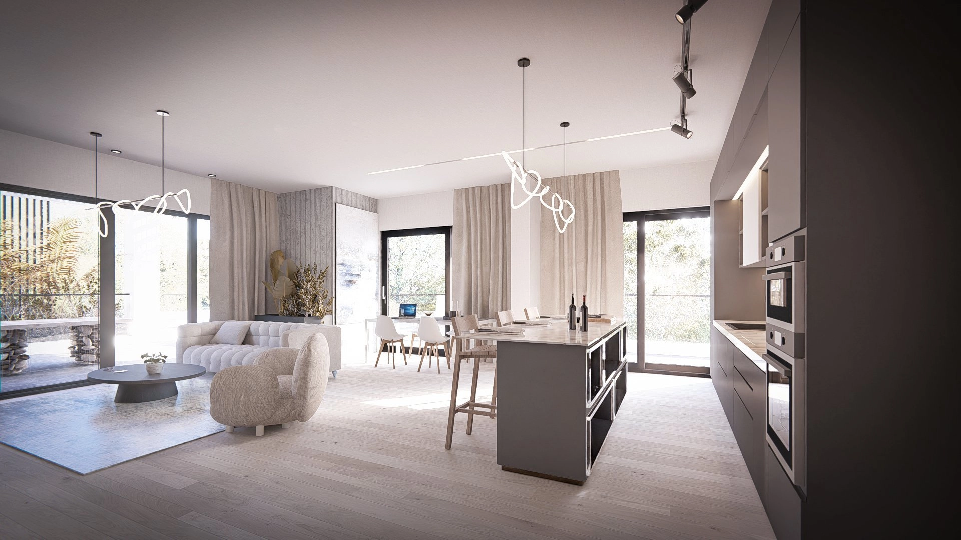 The interiors are designed for both everyday life and entertaining, with a large open-plan kitchen, dining, and living area that opens onto a private veranda. The kitchen is fully equipped with premium appliances from Bosch, Midea, and Samsung, offering a perfect blend of style and practicality.