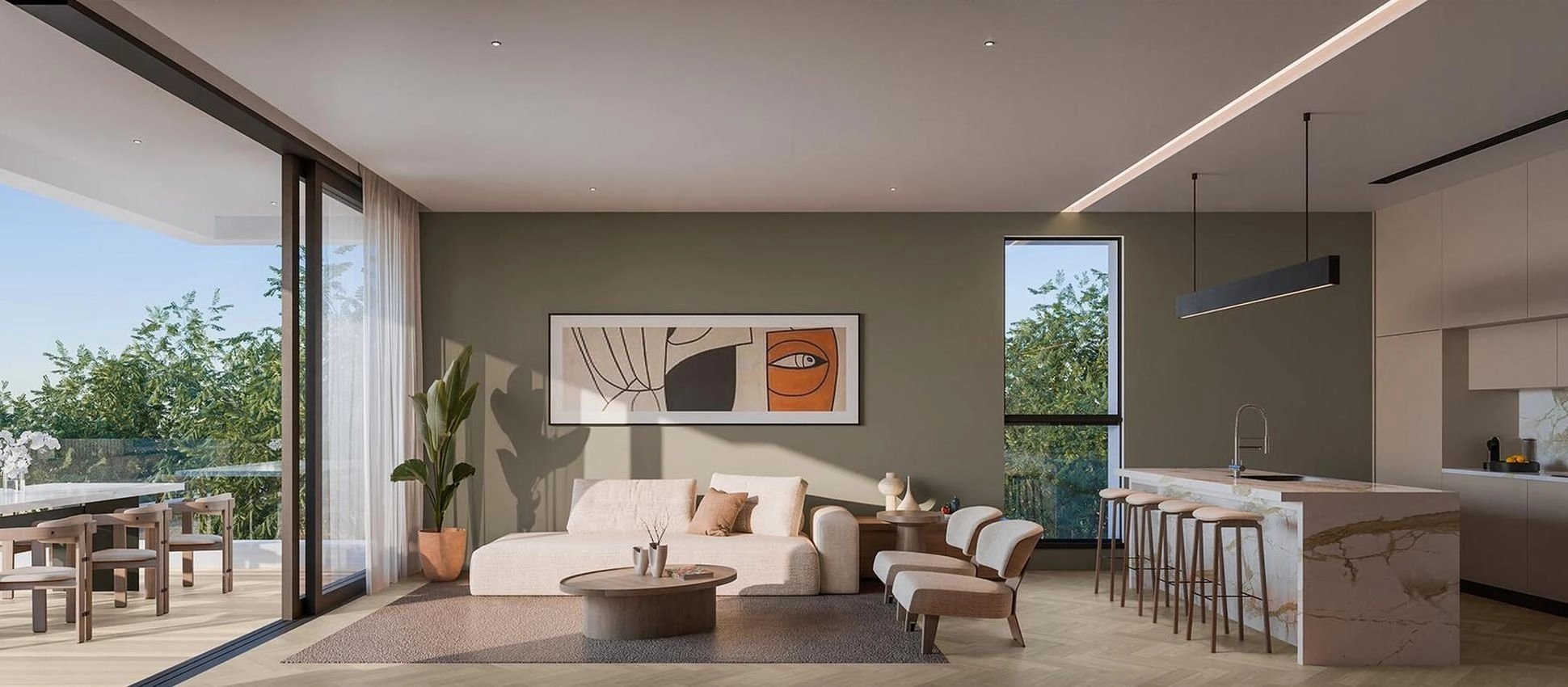 Residential complex features a selection of meticulously crafted apartments, townhouses and villas. The development embodies a design ethos where elegance meets minimalism, characterised by clean lines, open layouts, and high-quality finishes. The architecture and interior design focus on creating serene, functional spaces that exude sophistication.