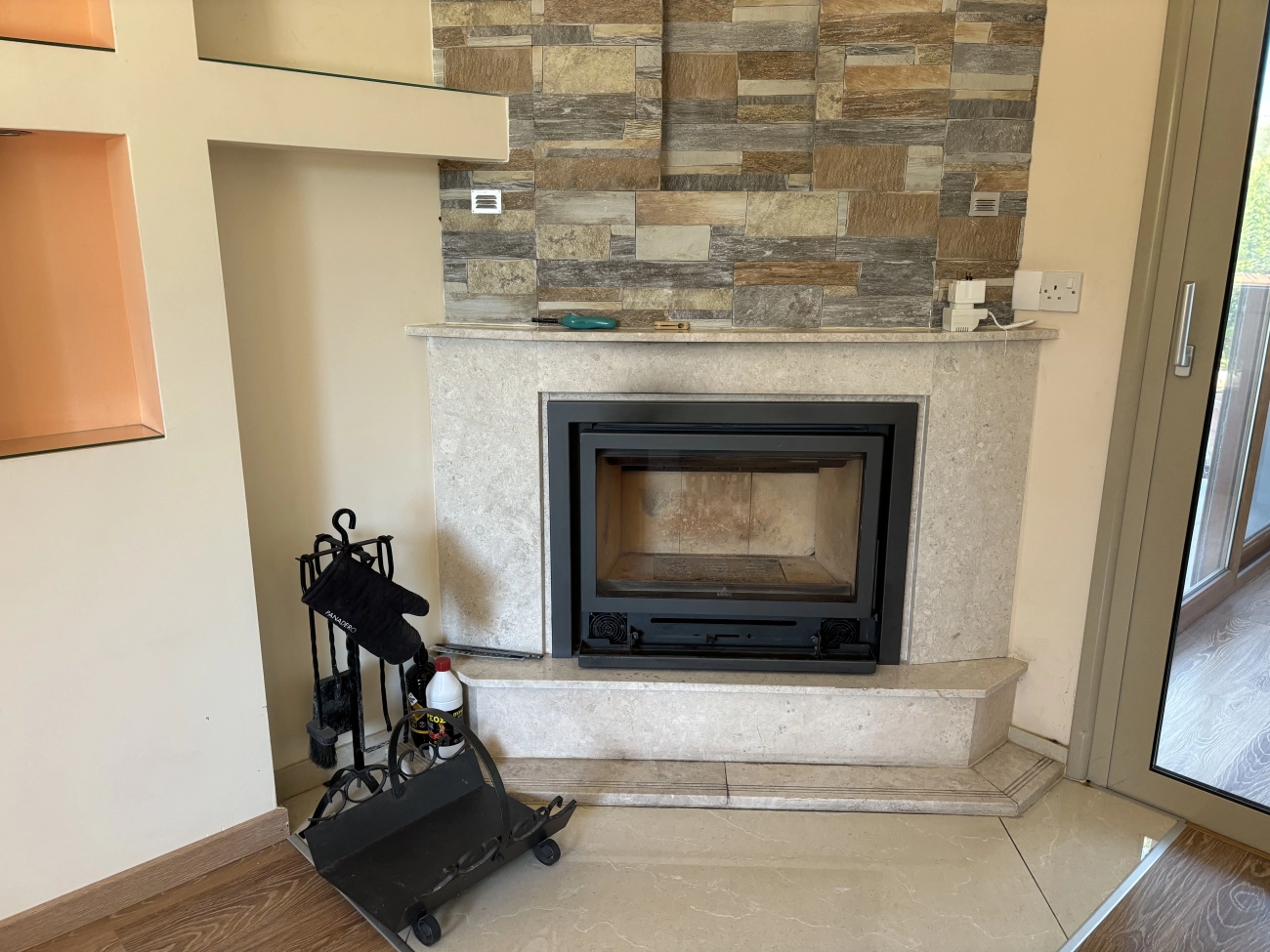 Outdoors, the expansive 1,422 m² plot includes a large private swimming pool, mature Mediterranean garden, summer verandas, a winter pergola with fireplace, lawn, children’s play area and a dedicated barbecue space — ideal for relaxation and entertaining.