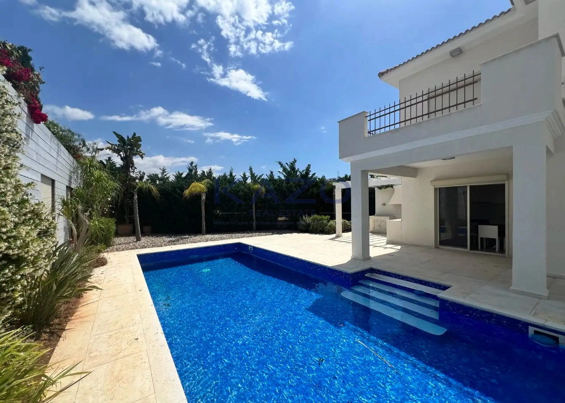 The residence features a private swimming pool, perfect for relaxing or entertaining guests. Large windows allow plenty of natural light, creating a bright and welcoming atmosphere throughout. The open-plan living and dining areas connect seamlessly with the modern kitchen.