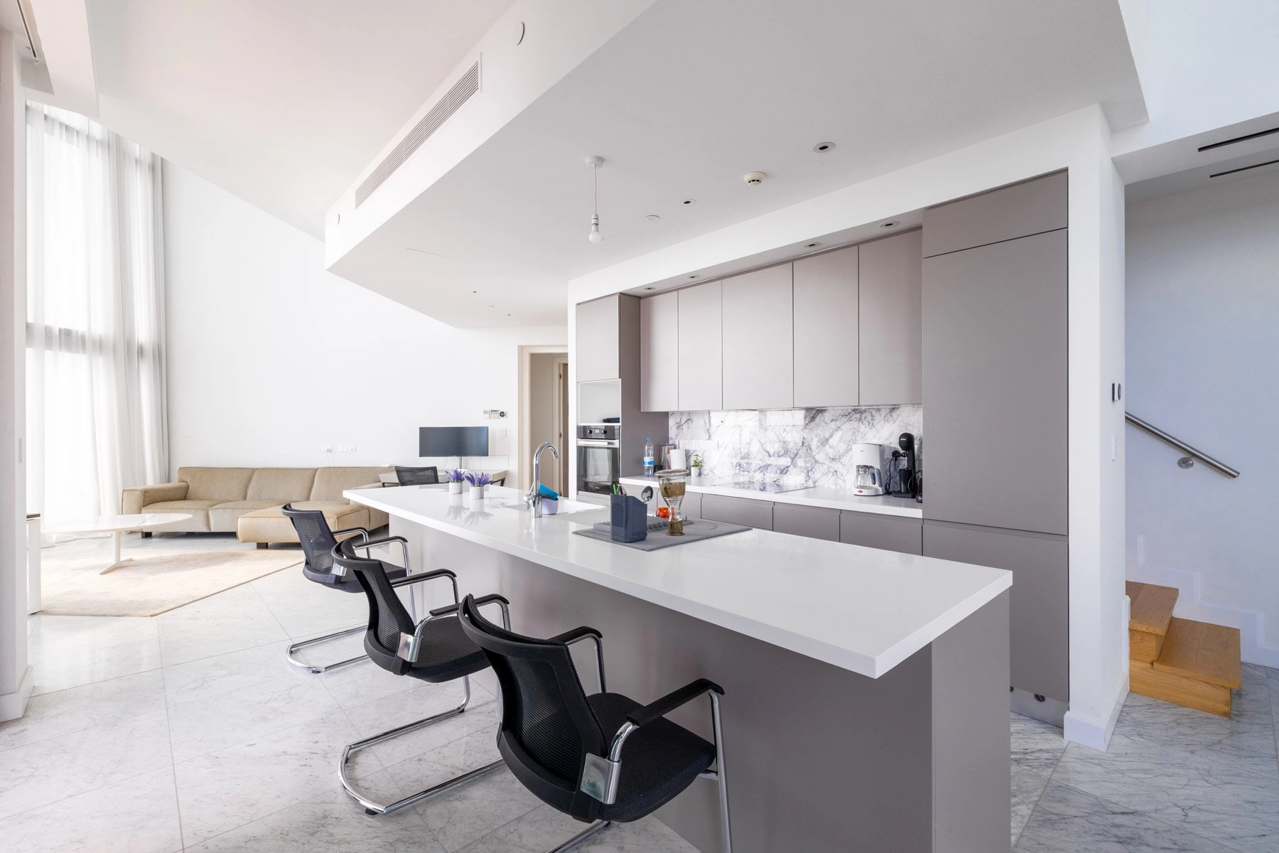 The apartment is situated on the top floors, offering breathtaking panoramic views of the sea and city. It also includes two underground parking spaces for maximum convenience and security.