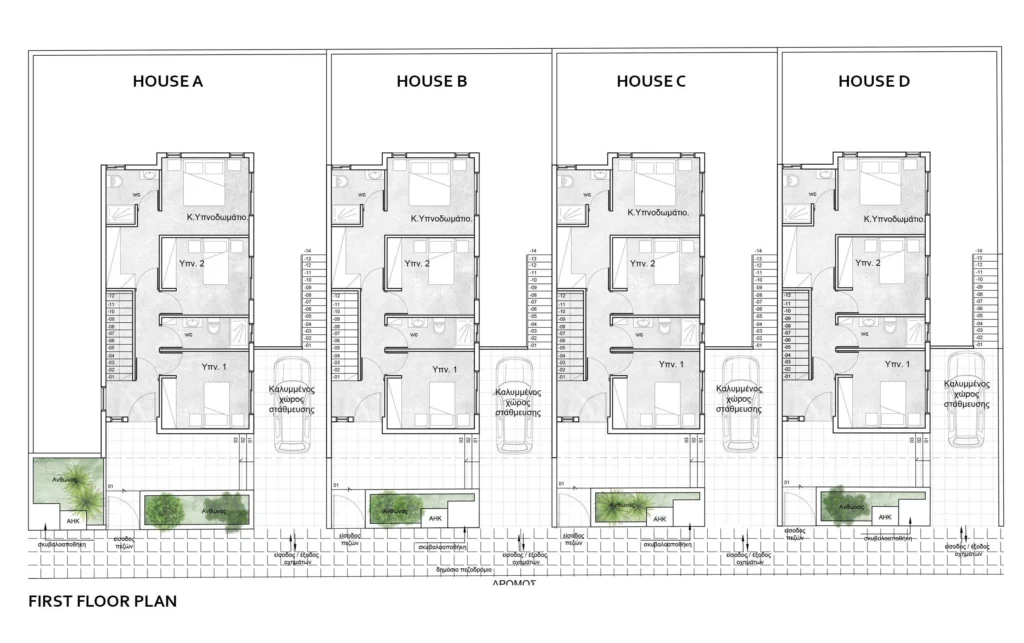 • Enclosed parking area, modern railings, and landscaped surroundings