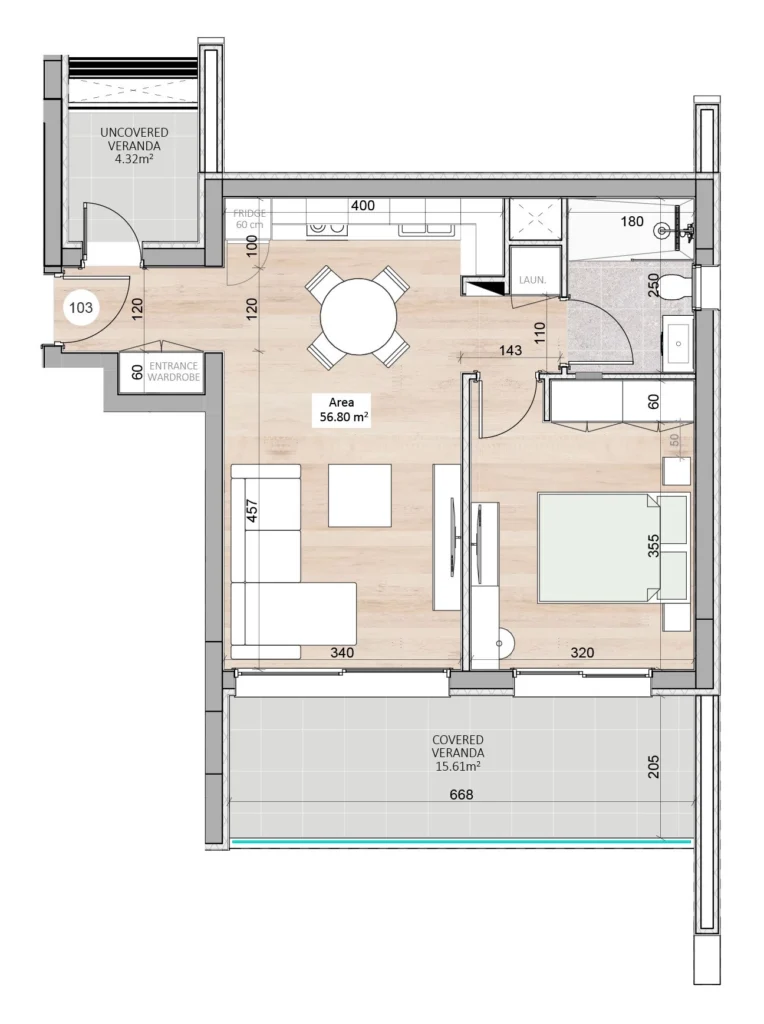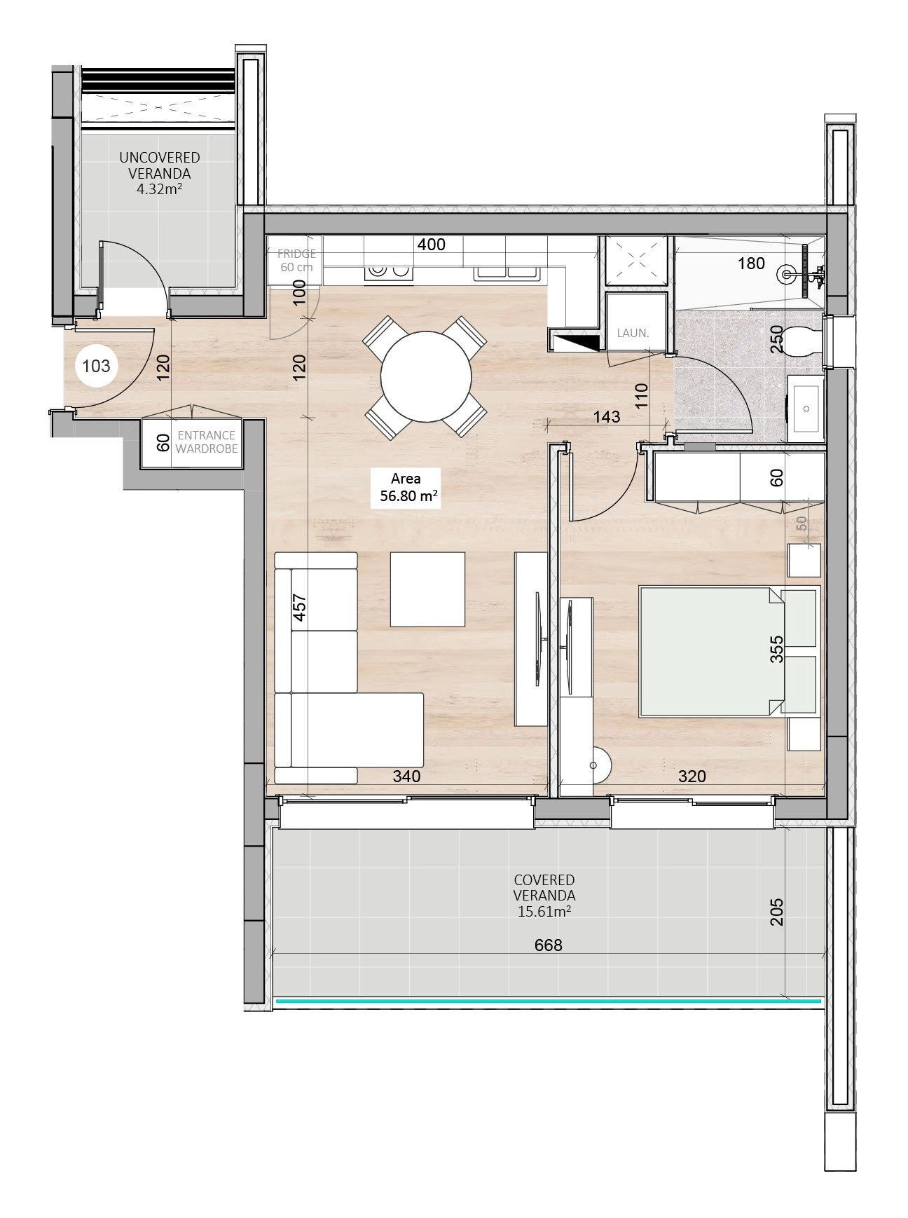 One-bedroom apartment 103, with a living area of 57.11 m², is located on the first floor of a four-storey building in Block A.